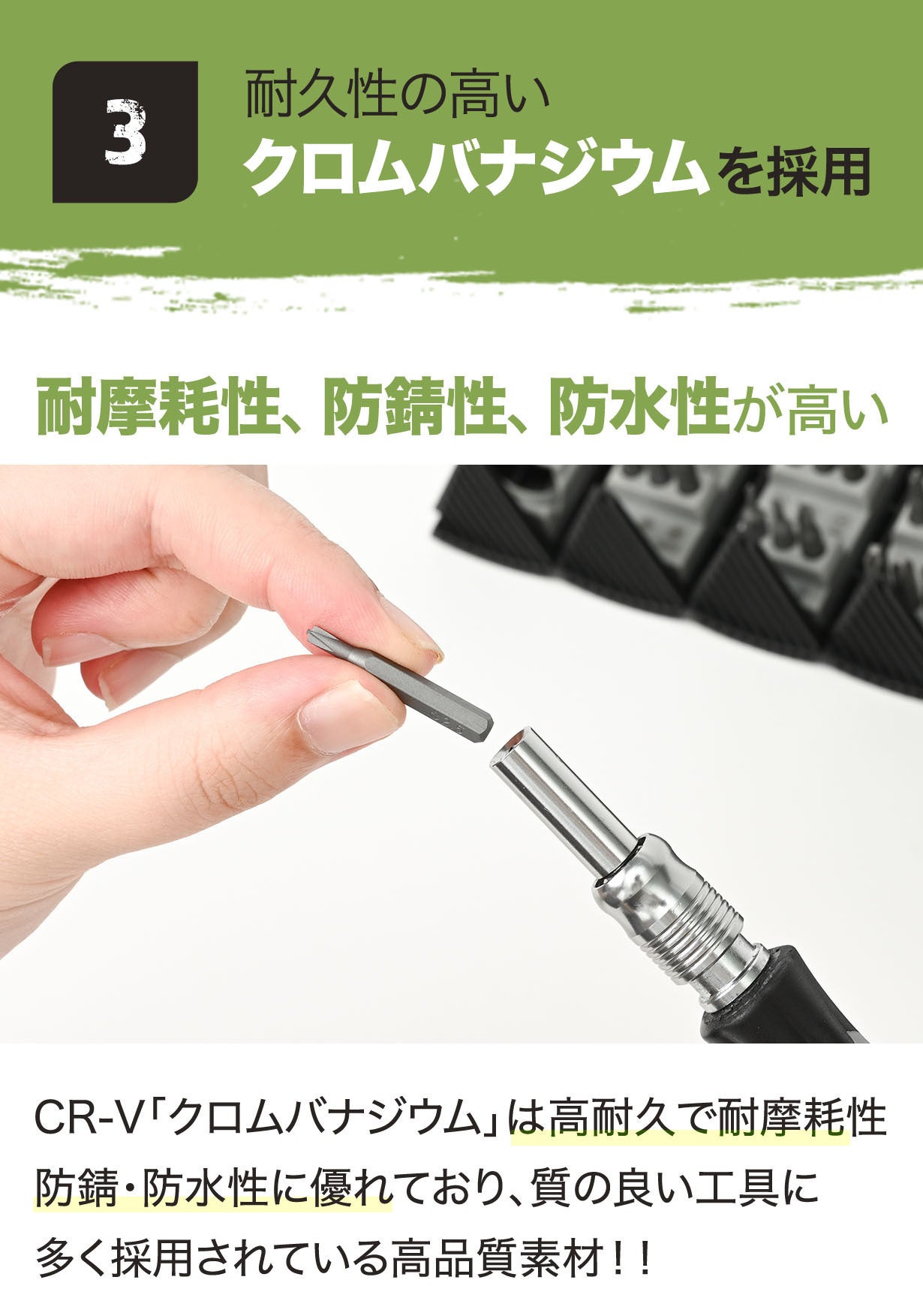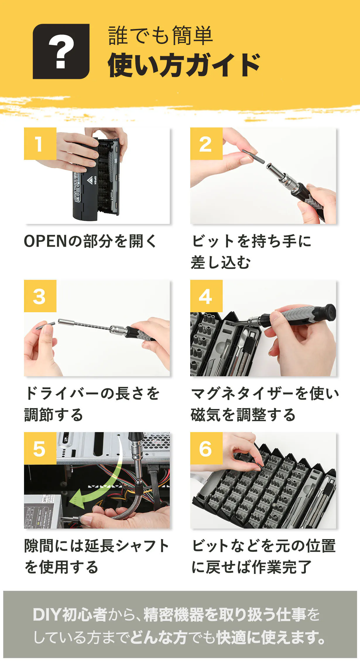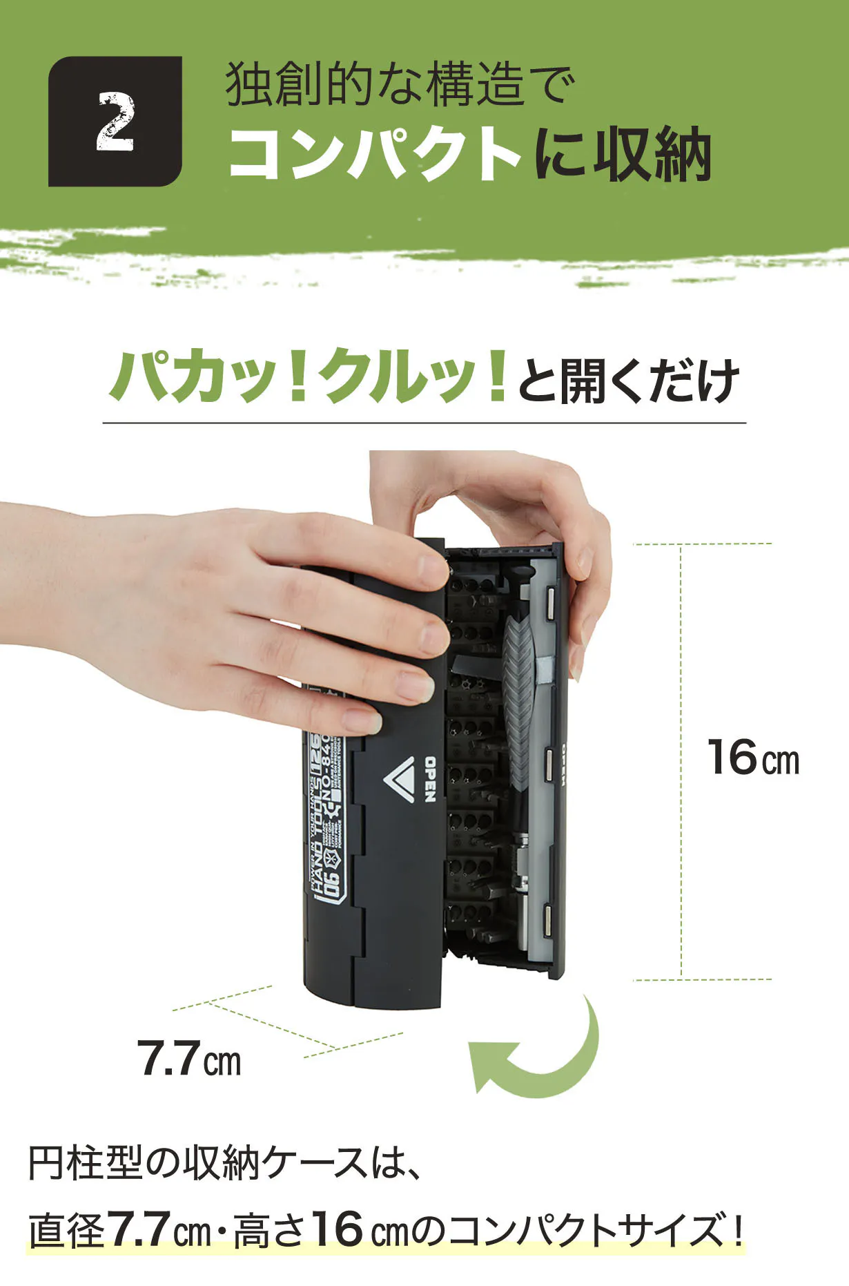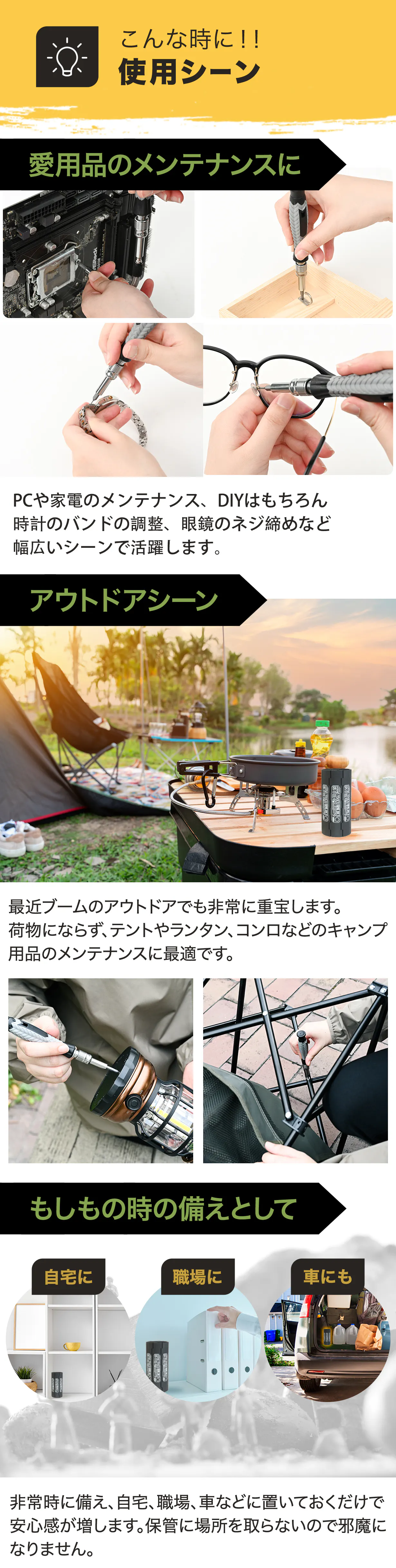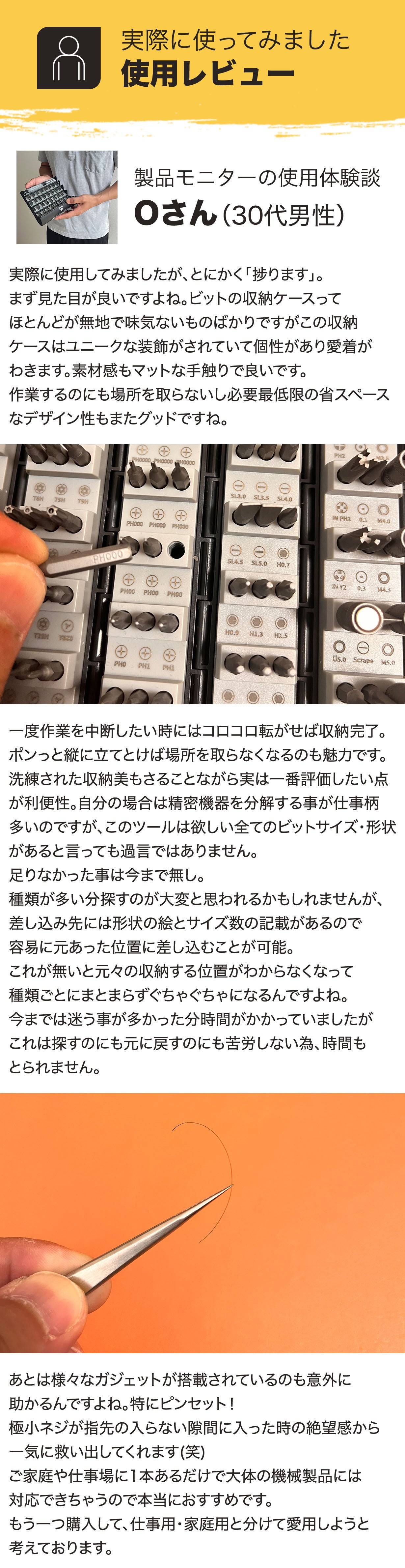 キャンプ場のオーナーは、貸出用に持ち運びしやすい工具を探したそうですが、収納しやすく、多彩なビット数を兼ねそろえている商品がなかったとのこと。