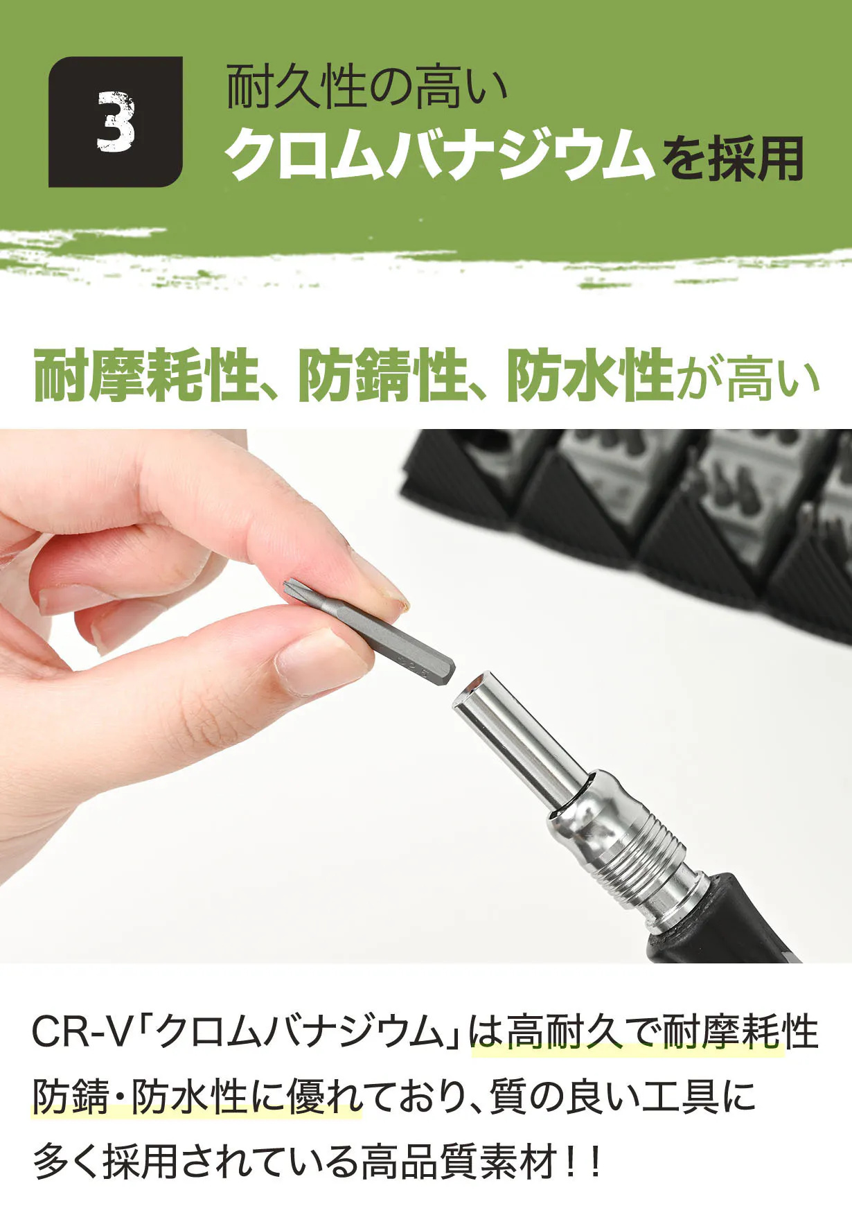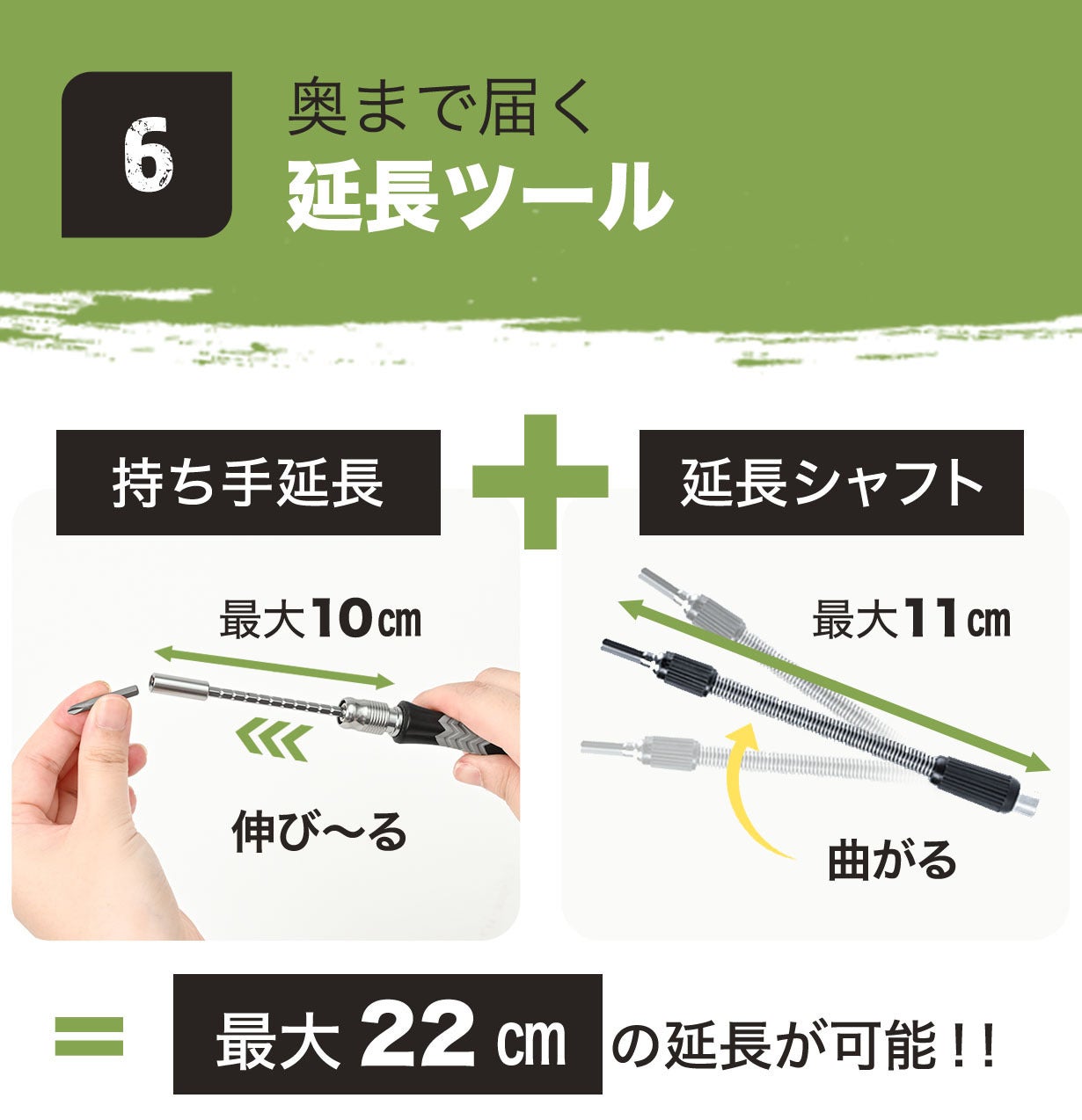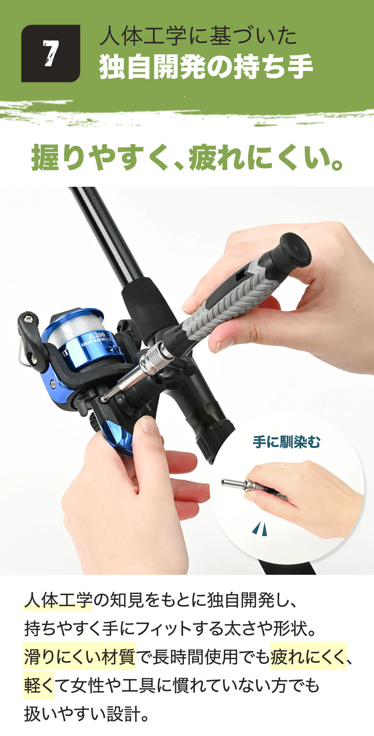 また、アウトドアシーンでより活躍できるように、モニター様のご意見を参考に、既存モデルから改良(ビット接続部の強化、延長部分がよりスムーズに延長できるようにする)など、屋外で短期間でスムーズに作業が終えることができるように、改良を加えました。