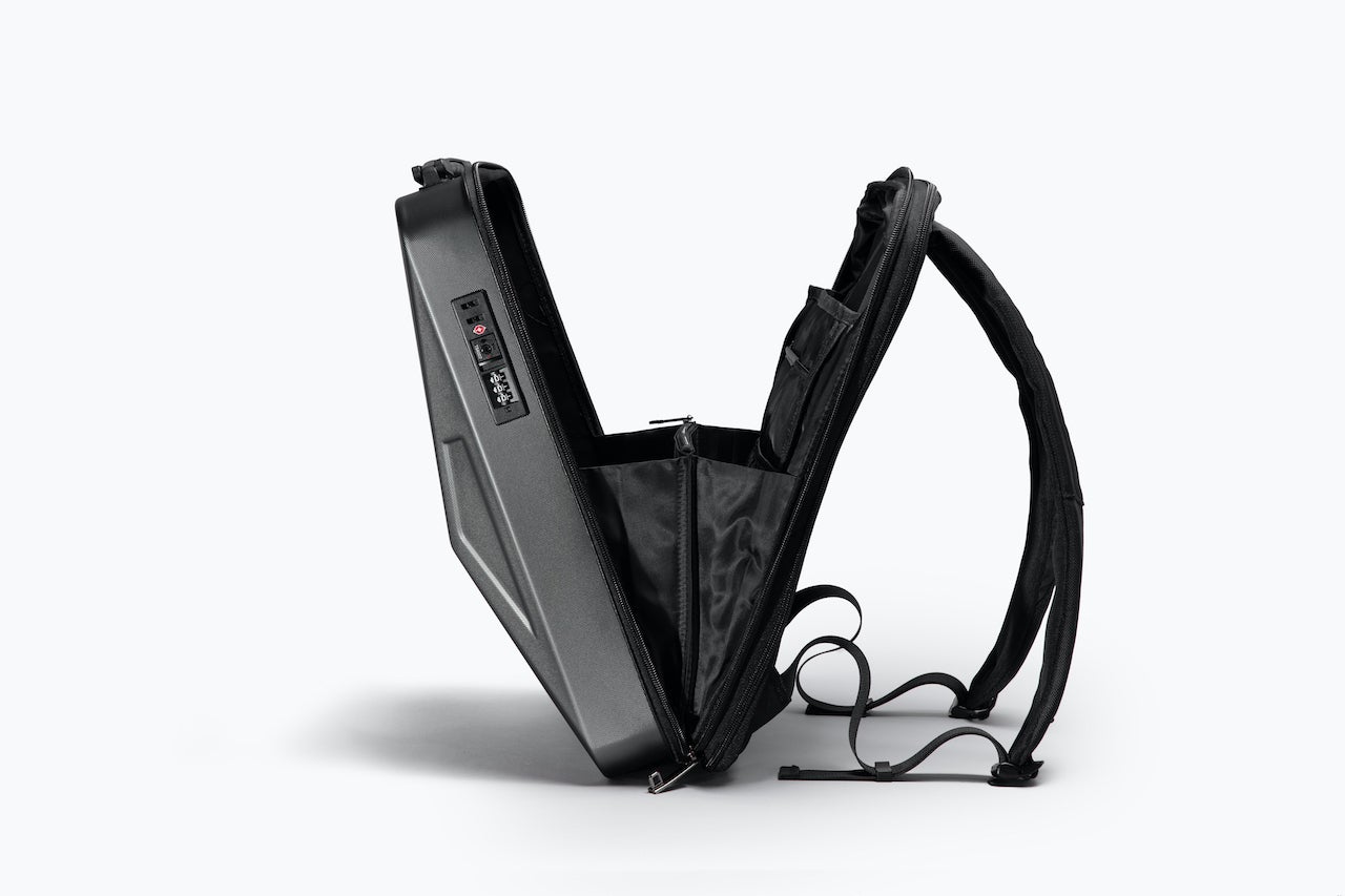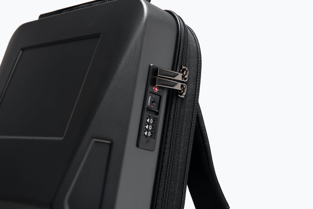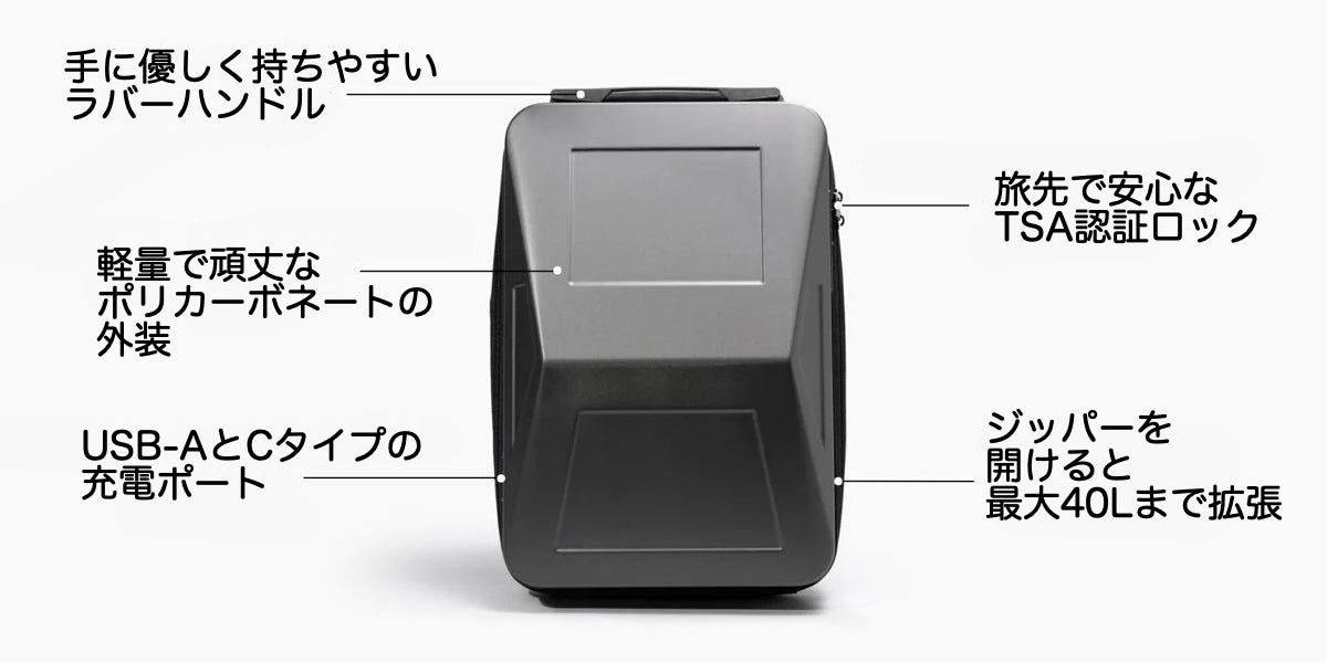 外装は、1枚のポリカーボネート樹脂から真空成型。仕事や旅行にぴったりな機能とサイズ。万全の盗難対策と軽量設計。