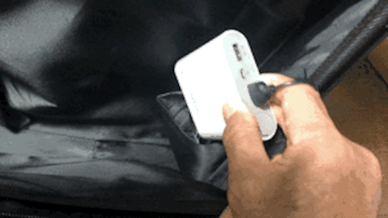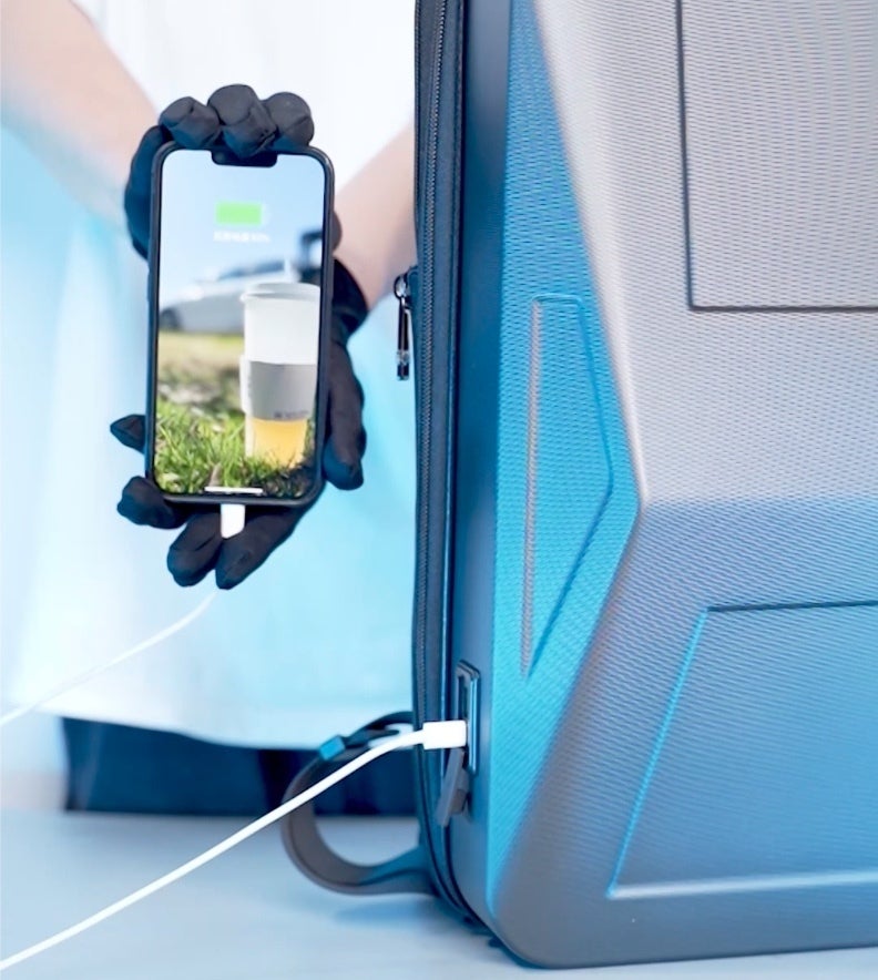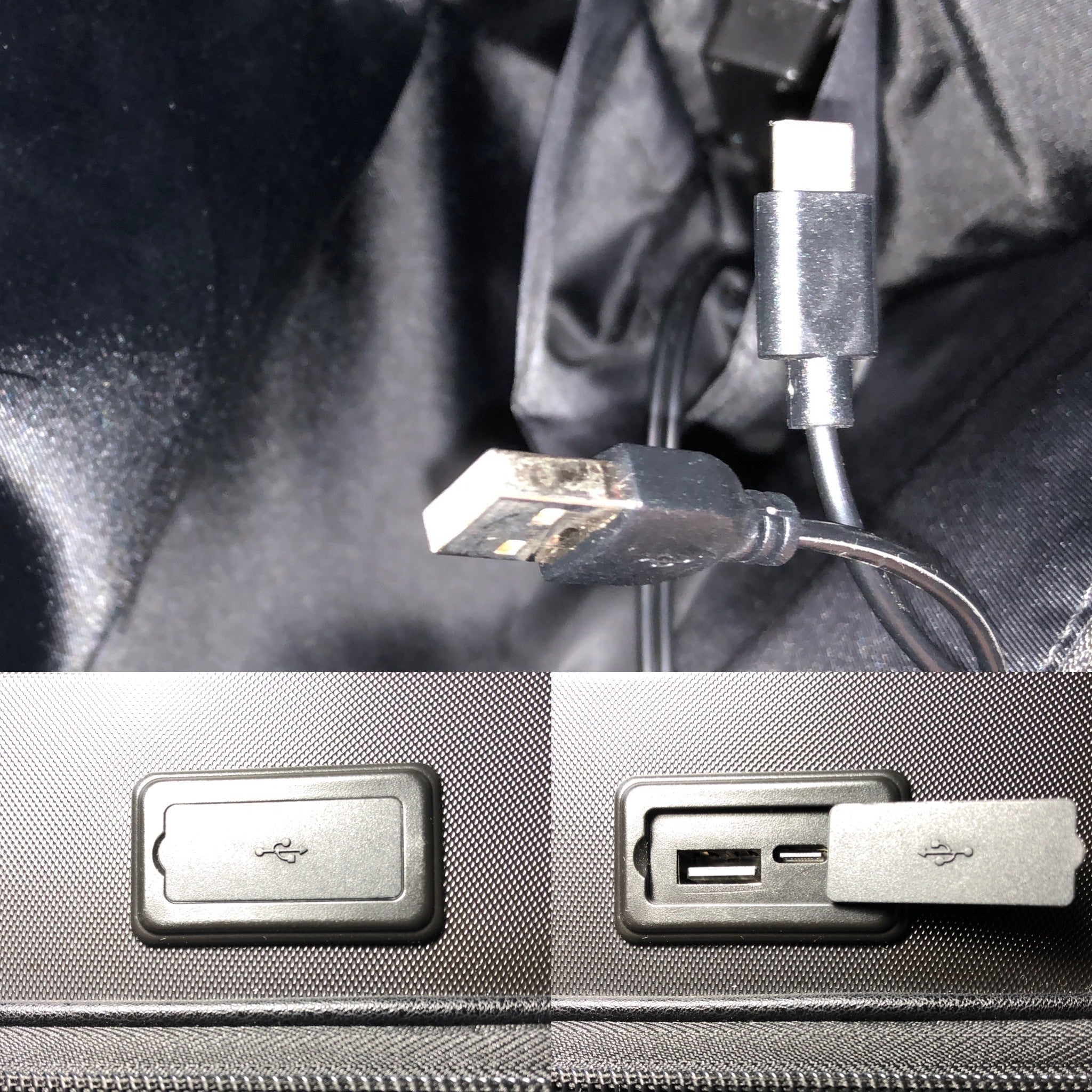 CYBER PACKの内部には、USB-AタイプとCタイプの端子を備えたケーブルが付いています。そこにお手持ちのモバイルバッテリーをつないでおけば外側の充電ポートから充電が可能。充電ポートは樹脂製のカバーでしっかり守られています。