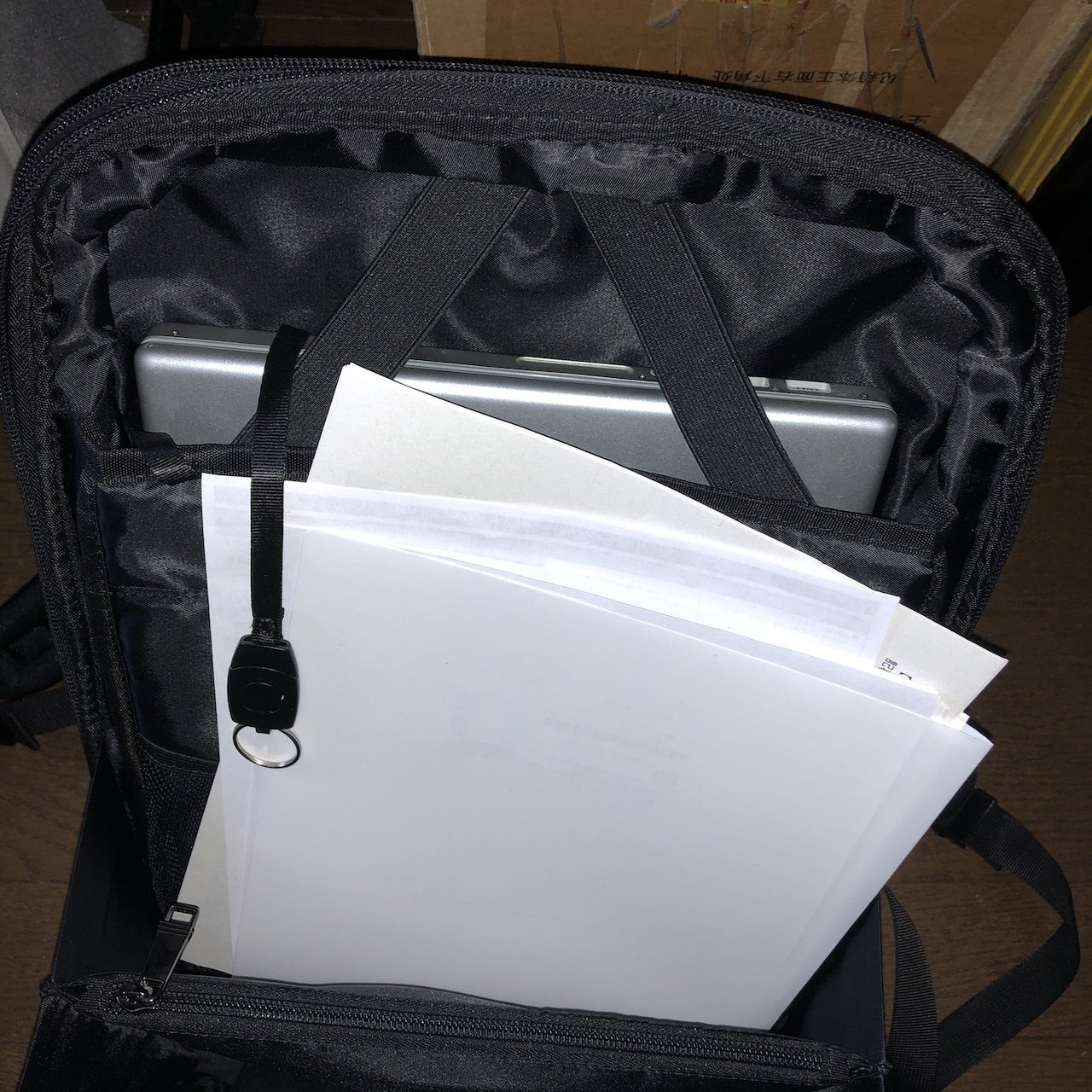 下の画像は適当に書類を突っ込んでオフィスまで小走りで来て、開けてみた時のものです。入れたときのまま、シワもありませんでした。(左に見えているリングはキーホルダーを付けておくもの。これも便利機能です)実際に使用してみると、思った通り書類など内容物をガッチリ守ってくれると確信しました。雨が降ってきても体の前に回すこともせず、そのまま平気な顔をしていられます。充電しながら歩けるのも大きな魅力です。