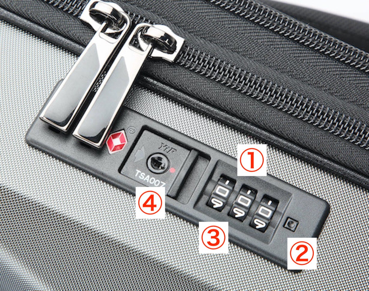 ※④の上にある鍵穴は、係官がチェックの際にTSAの合鍵で開錠するためのものです。CYBER PACKに鍵は付属しません。