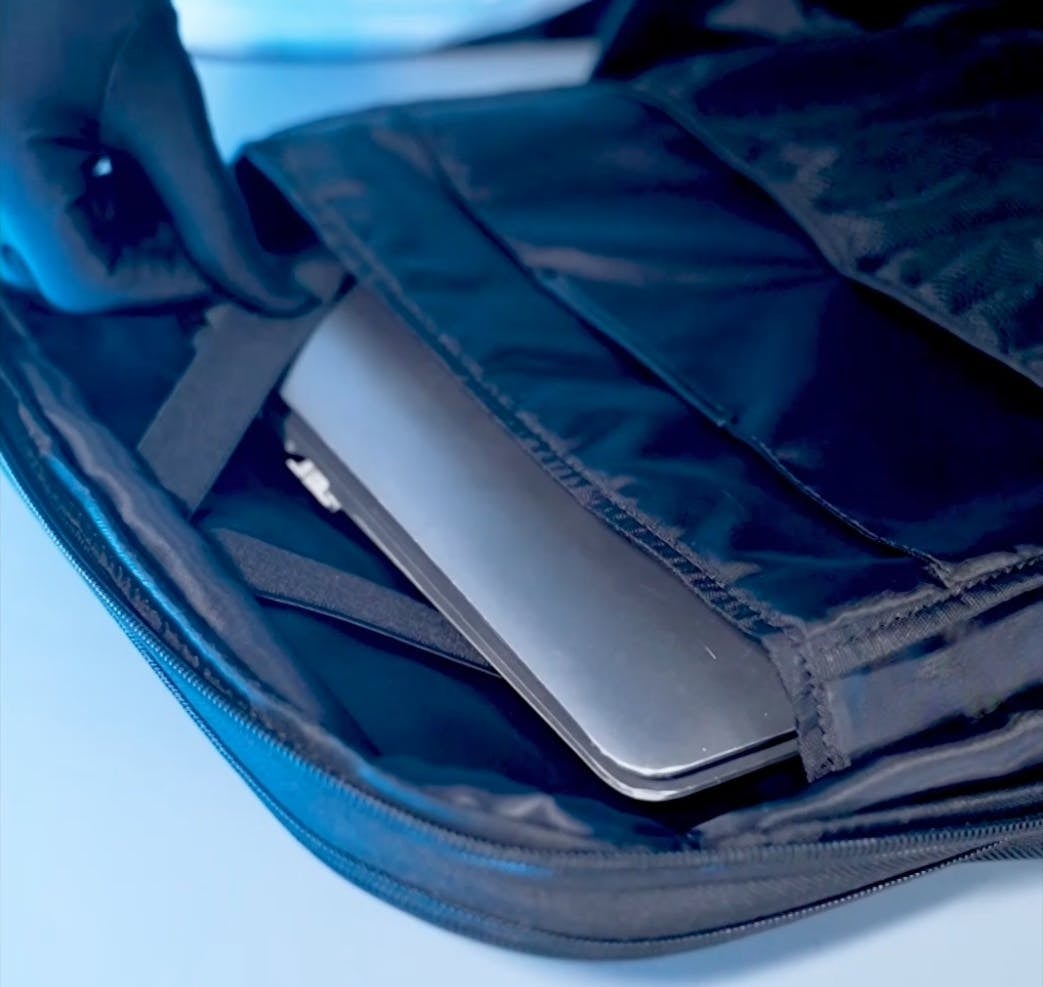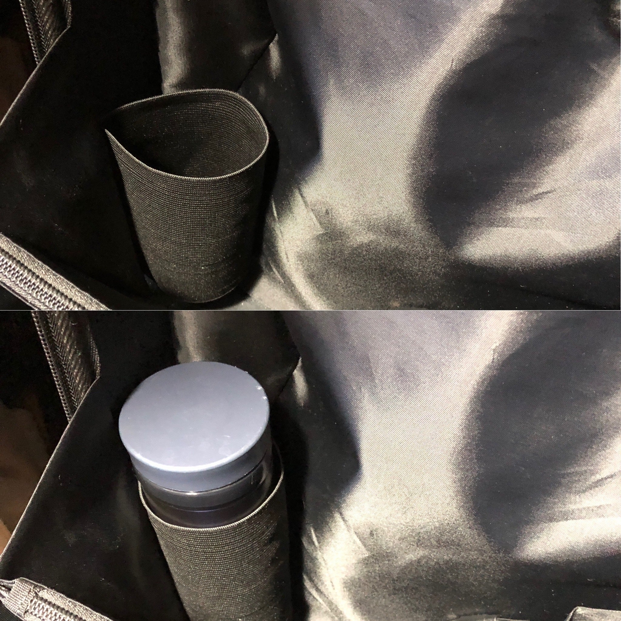 内部のポケットには、17.3インチまでのノートPCを入れておくことができます。もちろんパッド入り。さらにゴムの固定バンドも付いていますから、万一逆さまになった時も受けとめてくれます。