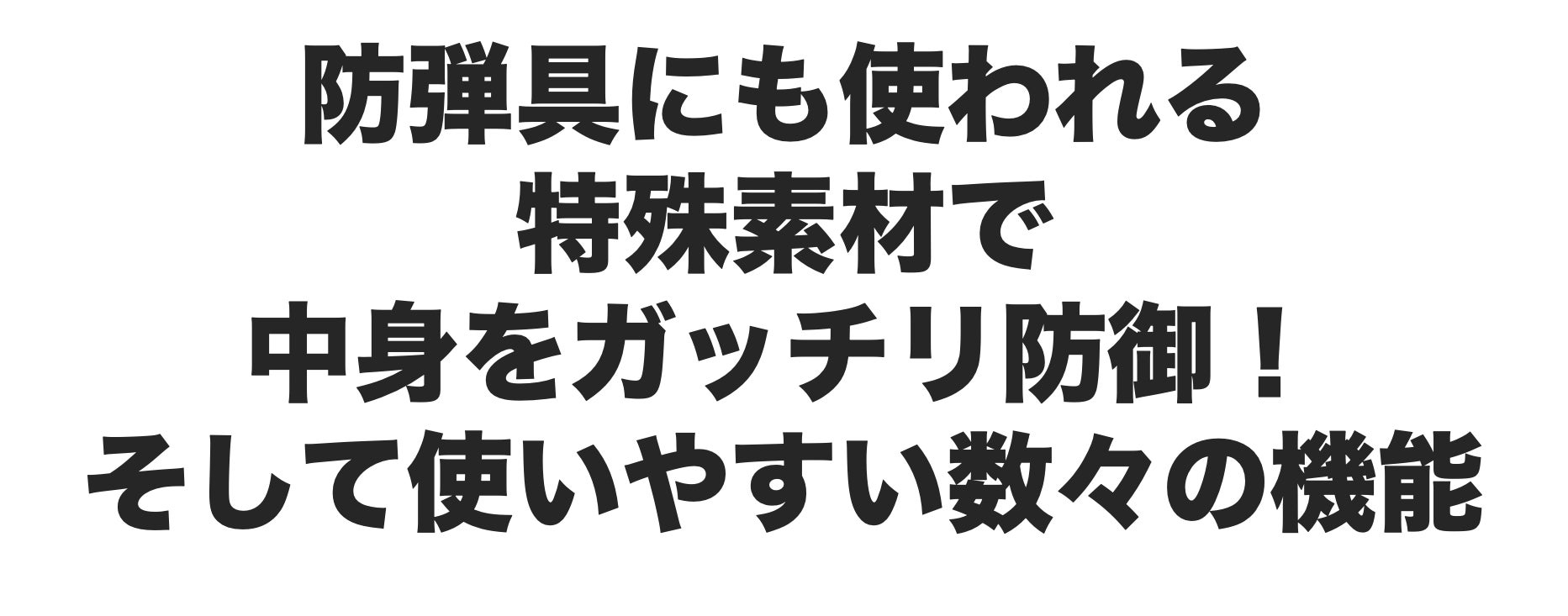「CYBER PACK=サイバーパック」の外装には防弾装置やジェット戦闘機にも使われるポリカーボネート樹脂を使用。型崩れとは無縁、ナイフなど刃物も刺さりにくく、防水性能もバツグン!中身をガッチリ防御します。
