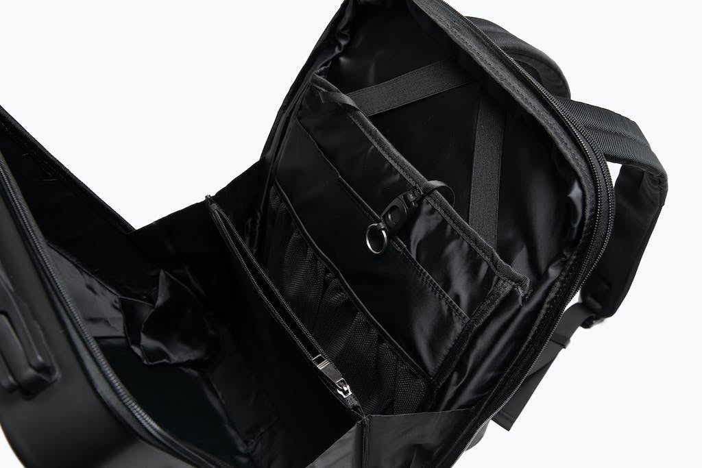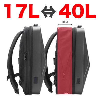 通常の荷室容積は17リットルで、書類やノートPCを運んだりするのにはじゅうぶん。そして出張で着替えやお土産を入れて中身が増えたときは、ファスナーをぐるりと開けばなんと2.4倍の40リットルに拡張! 前のモデルは奥行きが5cmの拡張でしたが、新モデルでは10cmに広がりました。頼もしいです!