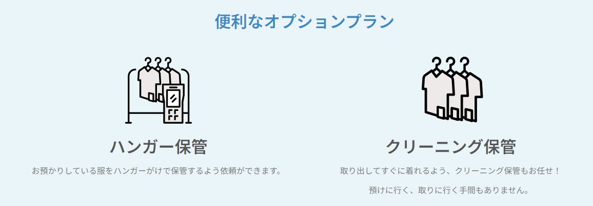 衣類を保管して頂いたお客様は以下のオプションが選べるます。衣類のクリーニング ⇒ クリーニング保管をするのでクリーニング屋さんに行く必要もなくなります