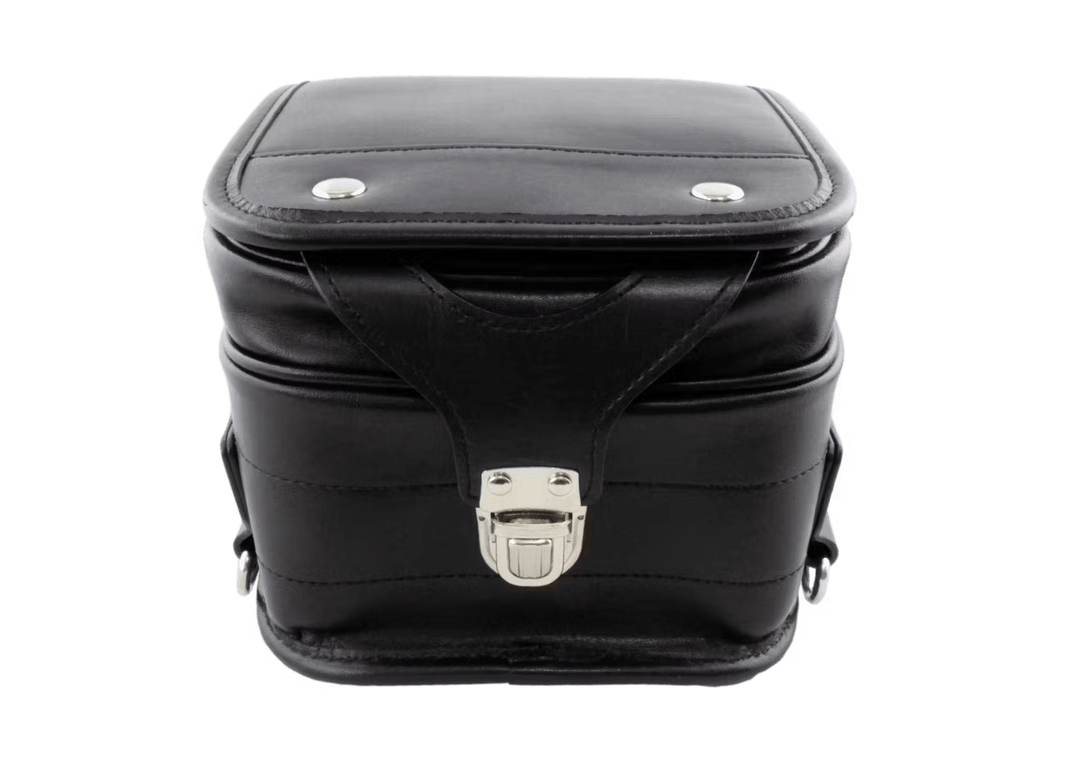 「かぶせ」から2又の革を通じて差し込み錠へ。ランドセルと同じ作りです。