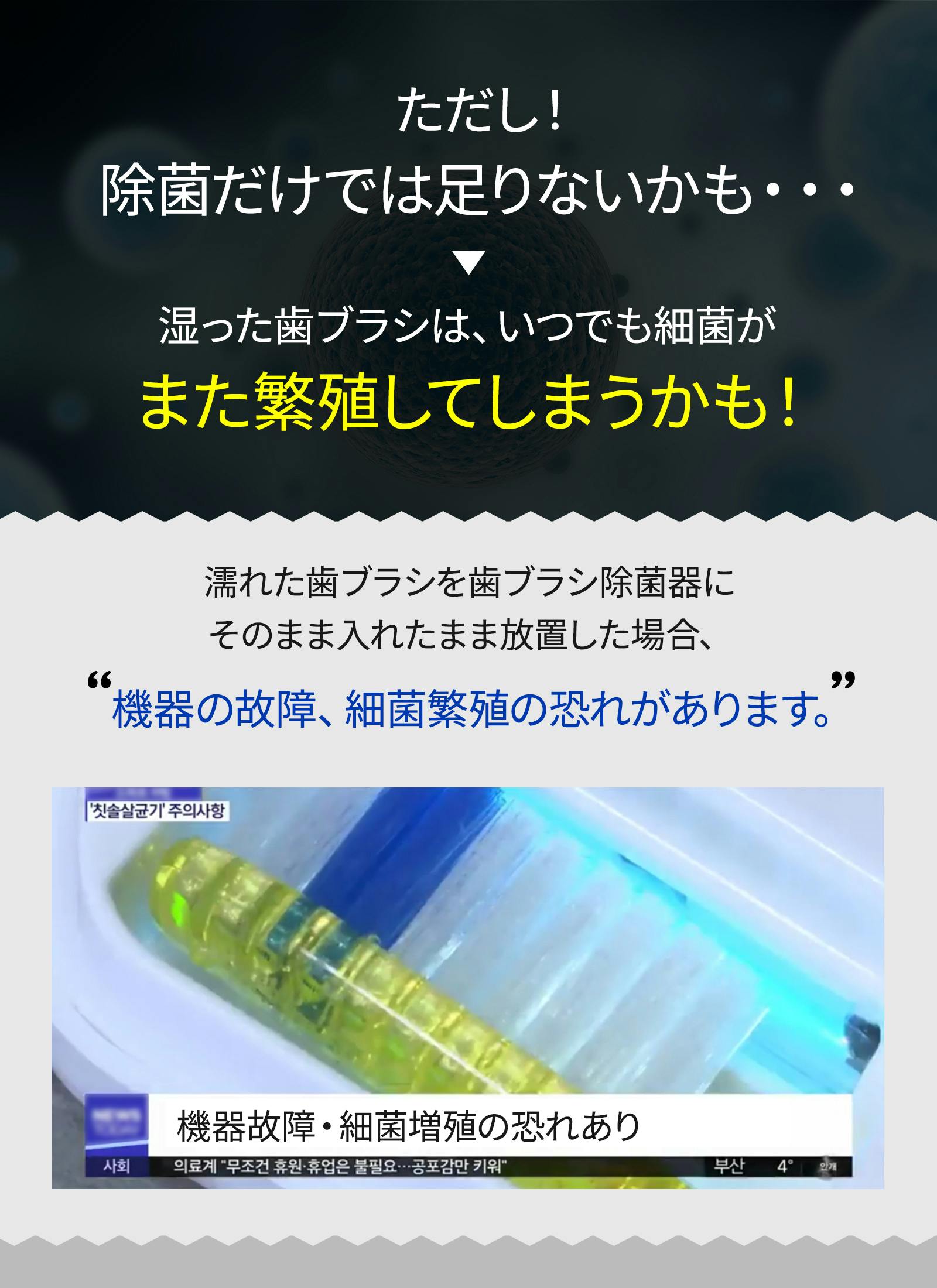 乾燥機能のない除菌器に水気の多い歯ブラシをそのまま入れると、内部湿度が上がるにつれて、防水ができず機器が故障したり細菌が繁殖する恐れがあります。