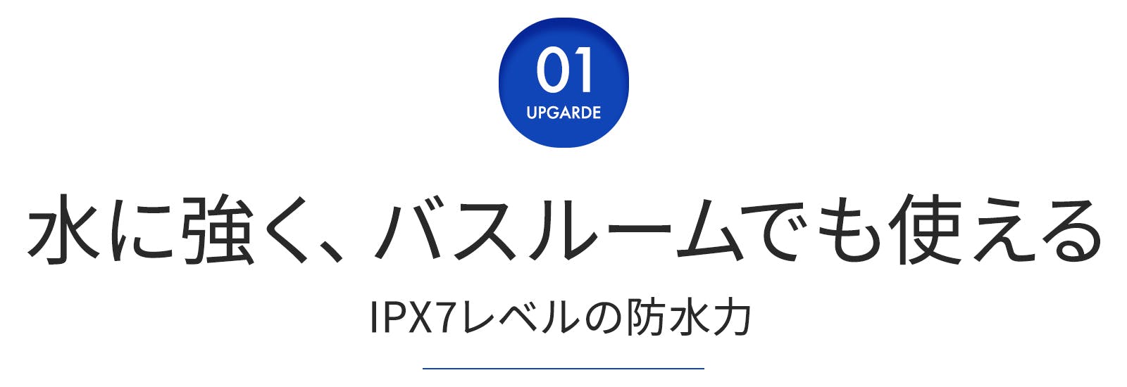 最大深さ1Mまで防水できるIPX7レベルの防水力だから、誤って水に落としたり、水気の多いバスルームに置いてご使用いただいても大丈夫です。
