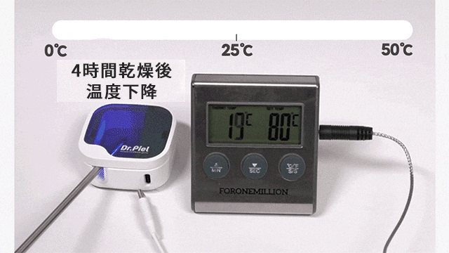 A.本商品は、ご使用者様の安定性を守るため、乾燥動作時には高熱で維持する持続発熱ではなく、温度センサーによる制御発熱方式を適用して40~60度の温度を維持します。また、自動乾燥オフ機能付きで、長時間充電ケーブルを接続しておいても接続してから4時間後には、乾燥機能が自動的にブロックされます。