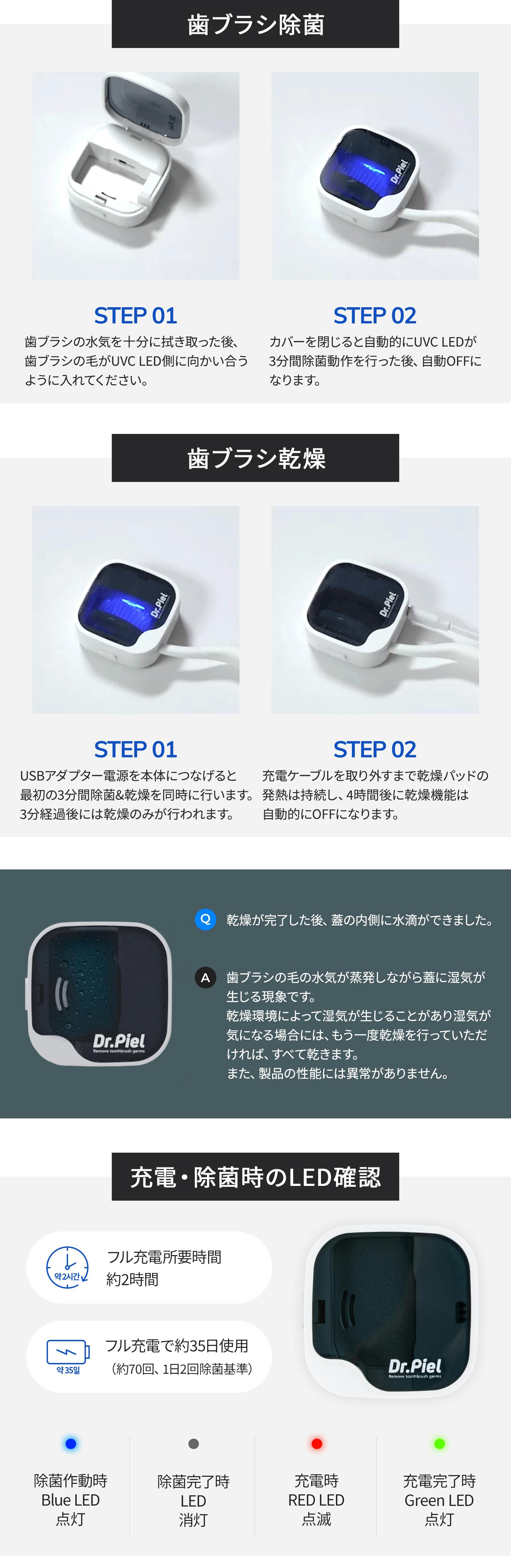 本商品の「Dr.Piel All New Cuving 歯ブラシ用コードレス除菌乾燥器」は、これらの問題に着目し、強力なUVC除菌とヒーティングプレートによる乾燥機能を加え、徹底的に歯ブラシを除菌し、歯の健康を守るために役に立つと思います。