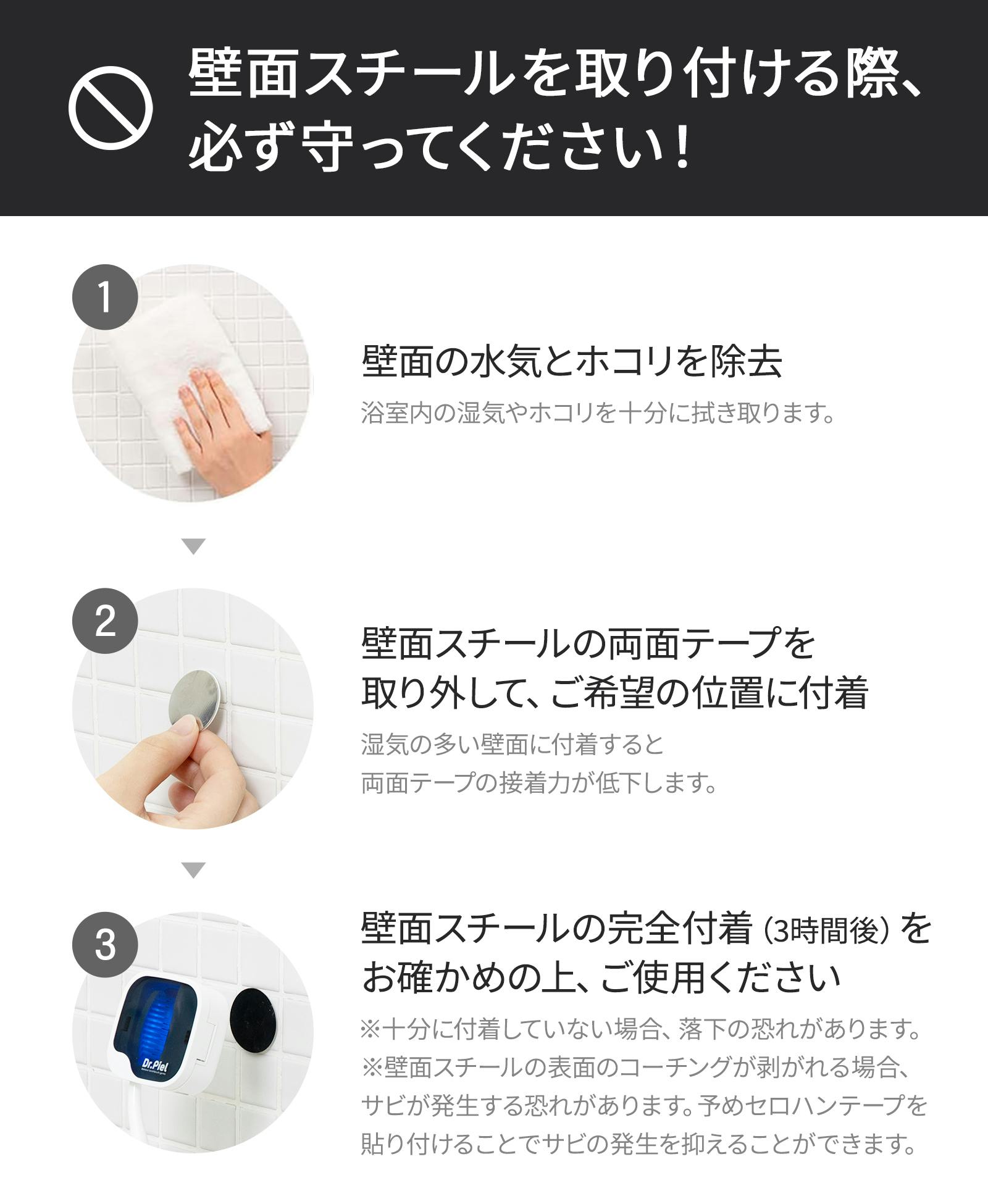 洗面台やお風呂などの壁に本体(磁石内蔵)が直接取り付けられない場合は、付属の壁面貼付スチール(磁石内蔵)をご使用ください。壁面貼付スチールの大きさを従来のキュービックから約1.5倍UPしたことで、より大きく強力な接着力を実現しました。