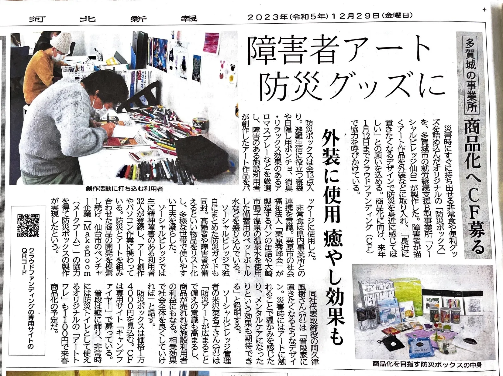 2023/12/29 14:27こんにちは!皆さまへ嬉しいご報告です。ソーシャルビレッジ仙台の取り組みが、河北新報にて掲載されました!取材いただいた事、また、新たにご支援いただいた皆さまにも、スタッフ一同、心から感謝申し上げます。今年もあとわずかとなりましたが、皆さまどうぞよいお年をお迎えください! もっと見る