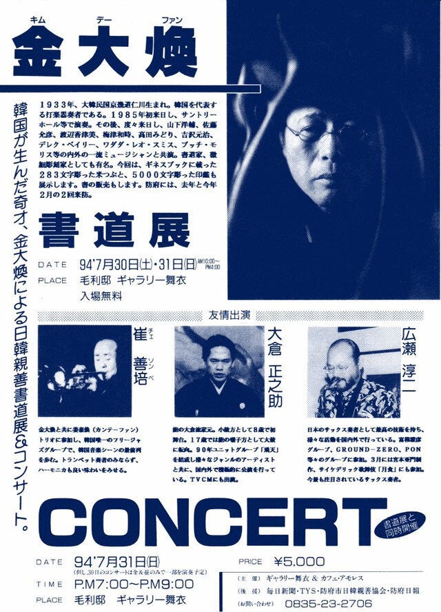 1994年に、韓国の打楽器奏者、微細彫刻作家、書道家として世界的にも突出した才能に溢れていた金大煥/キム・デファンさんの「微刻・書の展覧会&コンサート」を防府市毛利邸内ギャラリー舞衣で開催いたしました。金大煥さんが自身の作品に囲まれて演奏したのはこの時が初めてでした。この時の録音が残されており、この演奏を来年ちゃぷちゃぷレコードの30周年記念としてCDをリリースしたいと考えました。