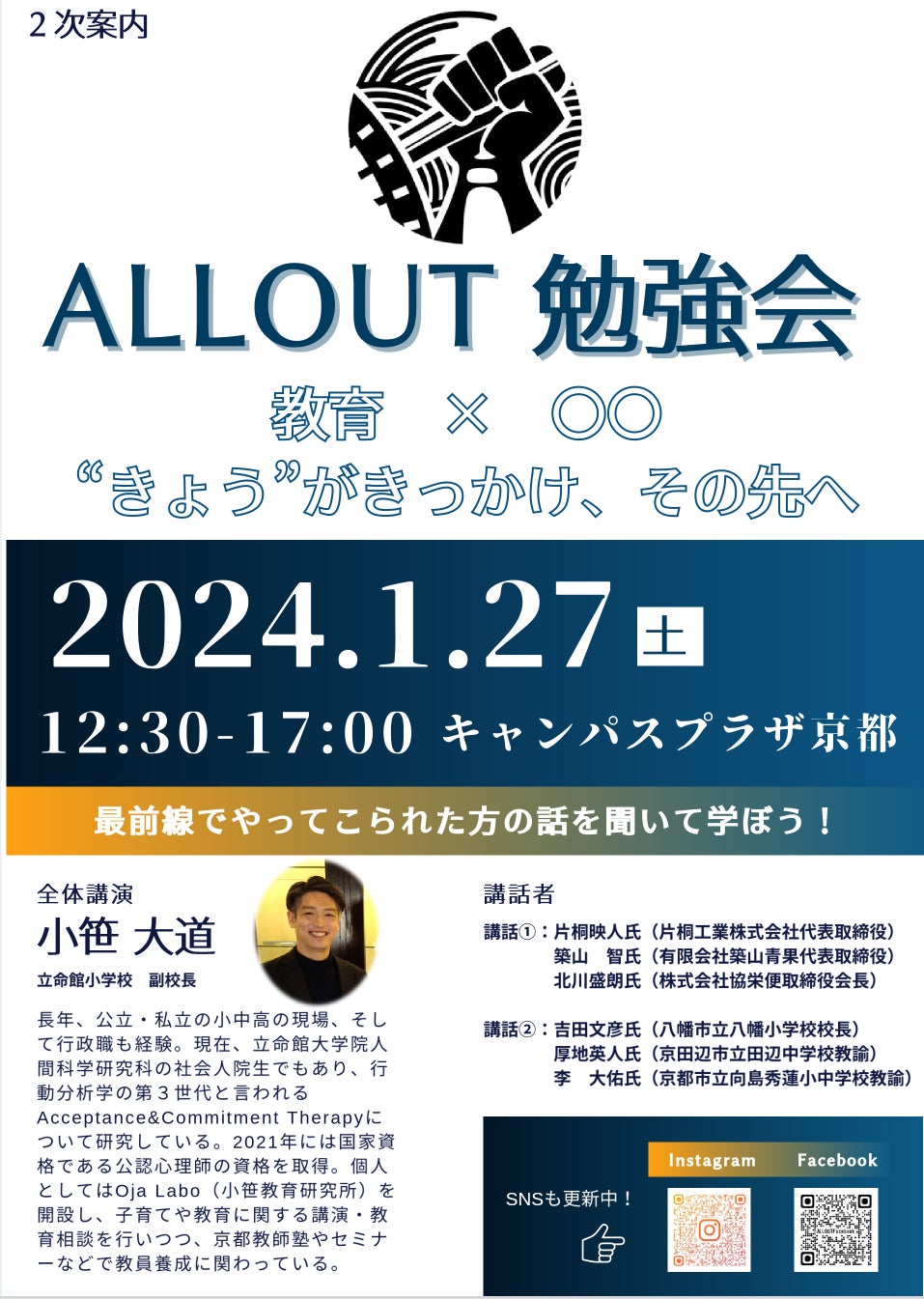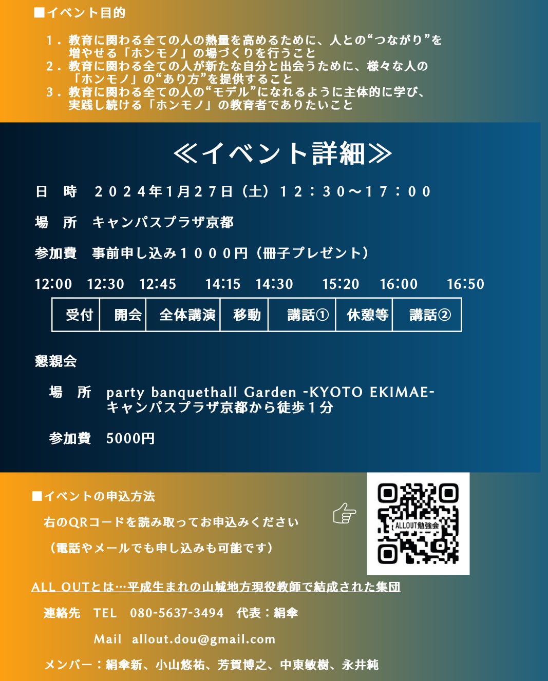普段は中学校で子ども達と共に成長し続ける教員である私たちですが、立場や考え方が違う教員同士が交流できる場をつくりたい!子どもにとって良い教育を妥協せずに考えたい!そんな願いを込めて、この京都で【ALL OUT】を発足させました。
