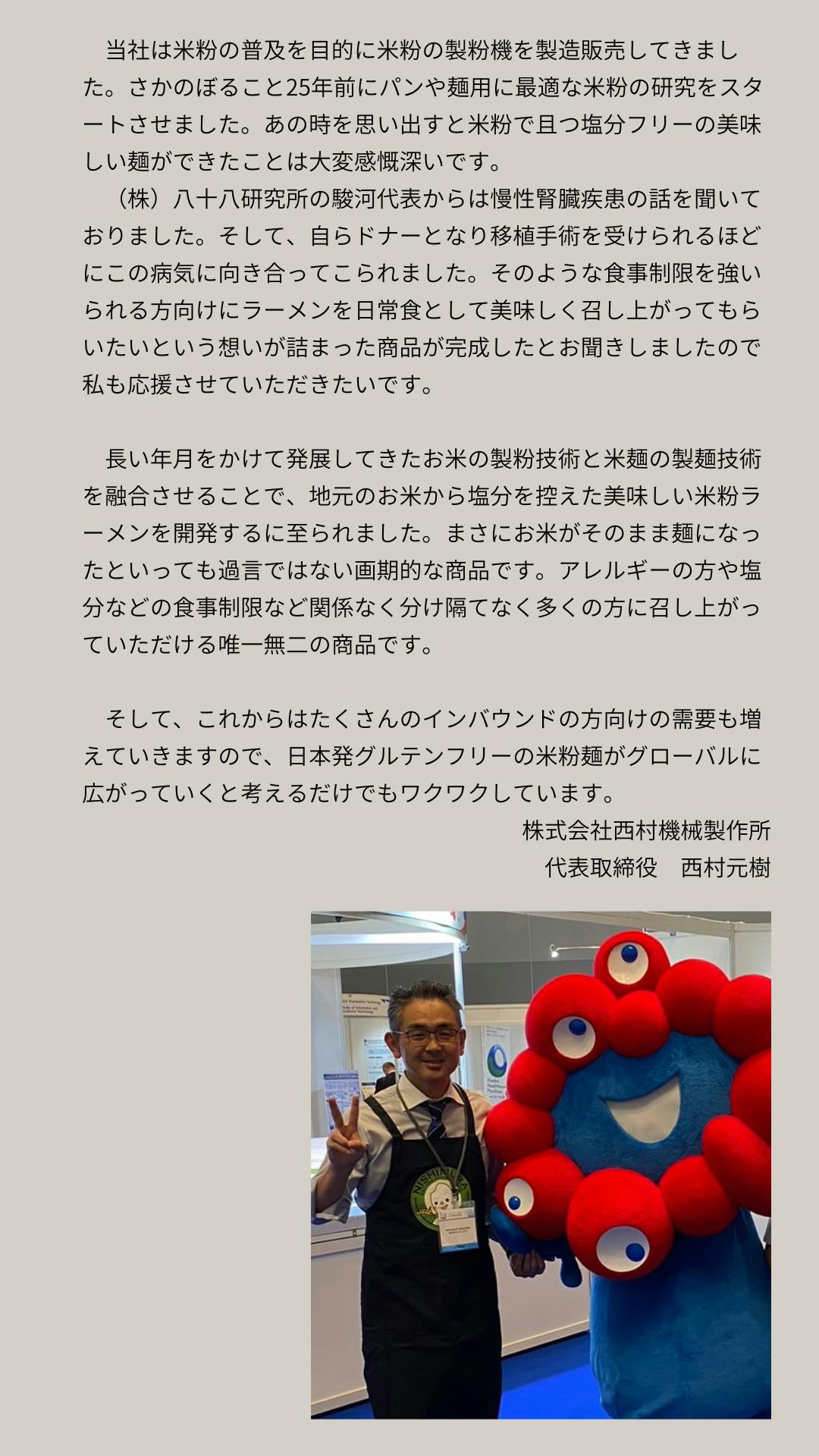 2024/06/10 11:30こんにちは!米粉のつるつるラーメン「あかり」プロジェクトの駿河かおりです。今回は、「あかり」をリアルに食べられるお店を、ご紹介させていただきます。〜憩いの店喫茶Rio〜京成本線八千代台駅東口から、徒歩2分、千葉県の食材をふんだんに使ったメニューが人気です。オリジナルの、ノンメタポークを使用した、『Rioポーク』も看板メニュー!「あかり」使用のメニューとして、【特製!冷やし中華】を季節限定メニューとして提供中です.店主の浅井 万亀子さん手作りのスープは、マイルドな酸味の醤油味をベースに、これも手作りの少しピリ辛の胡麻ペーストが、途中で味変しながら食べられて、お得感満載!たっぷりと載せられた、Rioポークと、隠し味を絡めた錦糸卵で、タンパク質もしっかりと補給できますよ!【その他の「あかり」メニュー】★スペシャル担々麺★鶏の手羽元で取ったスープは、コクがありながらも上品な味わい。千葉県産ピーナツを、滑らかなペーストにして味付けしており、ここでしか味わえない、スープとなっています。また、トッピングのお肉も、店内で豚ロースをひき肉にして載せているので、脂っこくなく、ペロリと食べられます。★減塩!醤油ラーメン★「あかり」特製の醤油スープ使用。トッピングを含めて塩分を抑えているので、塩分制限のある方にも、安心して召し上がっていただけます。その他、丁寧に淹れられたコーヒーや店主手作りのデザートも、絶品です!——————————-憩いの店喫茶Rio———————————-⚫︎住所:千葉県八千代市八千代台南1-1-10⚫︎アクセス:京成本線八千代台駅東口から徒歩2分⚫︎営業時間:月・火・金 11時〜19時土・日・祝 7時〜17時《定休日》水曜日、木曜日今後も、こうした取り扱い店様をご紹介していくのでお楽しみに!そしてぜひ、機会があれば食べに行ってくださいね。でも、どうしても遠いよ~~という方は通販をご利用ください。「自宅用」も追加しましたので、お求めやすくなりました。米粉のつるつるラーメン「あかり」自宅用【各2食入り5セット計10食】 | 八十八研究所 (88kenkyujyo.official.ec)(株)八十八研究所通販サイトこれからどんどん暑くなる季節。体温調節、水分補給をしっかりして、元気にお過ごしください! もっと見る