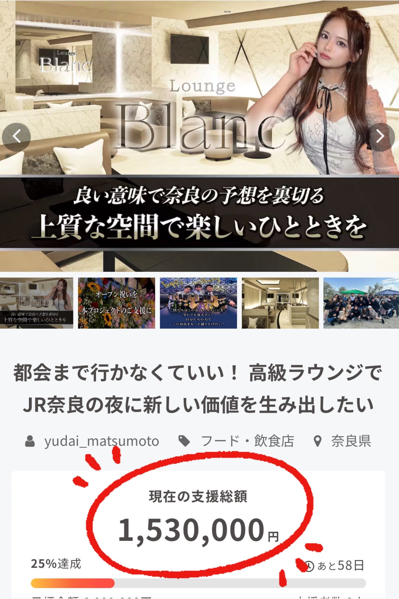 クラファン公開から2日が経ちました!公開から2日で153万円ものご支援が集まりました!本当にご支援頂いた方々有難う御座います。企業PRも兼ねた内装バルーンのリターンは早くも完売となりました!お会いした事のない方からもTikTokやInstagram見て応援してますと言葉を頂き、InstagramからDMをいただきお知り合いにならせて頂けました!そんな縁もクラウドファンディングを通して作って行きたいと思ってます!本当に皆さんの一つ一つのご支援に気持ちを感じて、勇気を頂いてます!不安も沢山あった中で沢山の方々がInstagramで宣伝に協力してくれて拡散してくれたり、挑戦を応援して頂ける言葉を掛けて頂きました。コメントも温かいものばかりで嬉しく思います。このクラウドファンディングはお客様に御来店時お得に遊んで頂ける内容になっているものを多く入れてます!まだお知り合いでない方もこの機会を通してお知り合いになれたら嬉しいです!代表と同伴が売れ残りそうです笑必ず皆様のご支援で奈良に素晴らしいloungeを作ります!皆様今後とも宜しくお願いします!