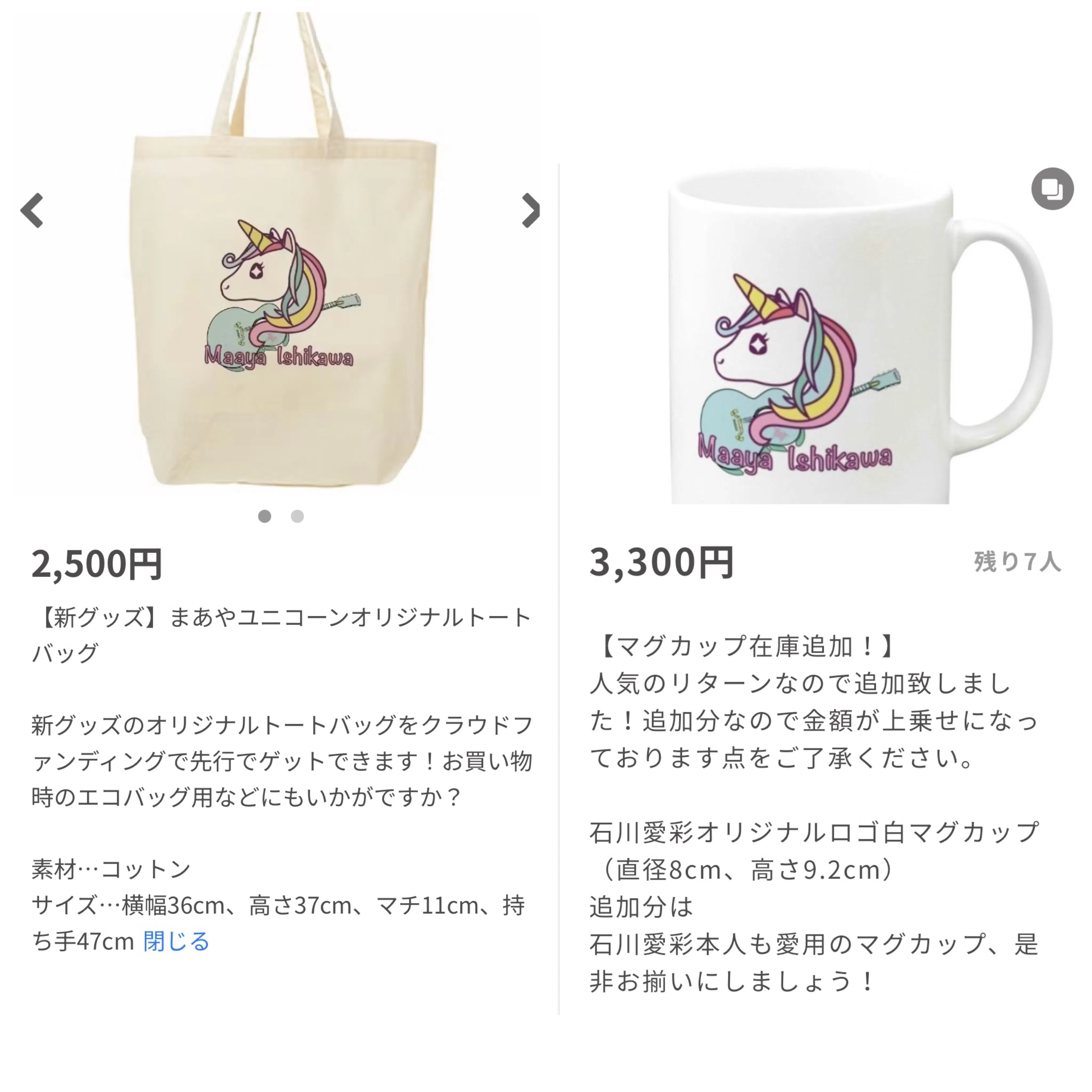 エコバッグ用やちょっとしたお出かけ、もちろんライブの時などにも身につけて、様々な場面で活用いただけそうな『まあやユニコーンオリジナルトートバッグ』です。