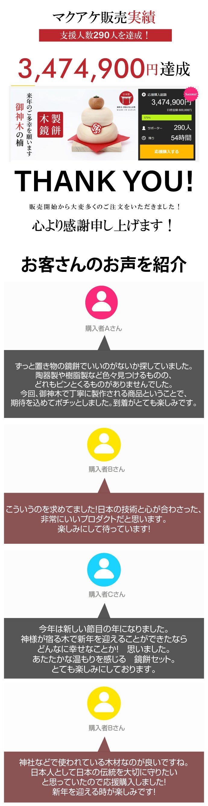 2018年より服飾雑貨、美容健康商品を自社製品開発・生産をしています。日常生活上である悩み、問題にフォーカスし便利、役立つ、サポートするをコンセプトにプロロジェクトを組んでます。今回のプロジェクトは無垢の国産材を熟練の職人が一つ一つ木を削り上げて作成した木製の鏡餅セットになります。日本の伝統であるお正月飾りのひとつ、鏡餅。本物の鏡餅を飾るのはカビやひび割れなどなかなか難しいものです。プラスチック製では、インテリアにはちょっと寂しい。そこで今回提案するのは熟練の職人が丁寧に仕上げた木の質感を存分に味わえる、温かみのある木製の鏡餅セットです。リビング、玄関、寝室、和室等、家の中にインテリアとしてお飾り下さい。ご家族の成長と共に変化を楽しめる天然木の鏡餅は、新年のご挨拶や新築祝いなどのギフトにもぴったりです。来年もご多幸溢れる1年になりますように、鏡餅を通してお祈り申し上げます。