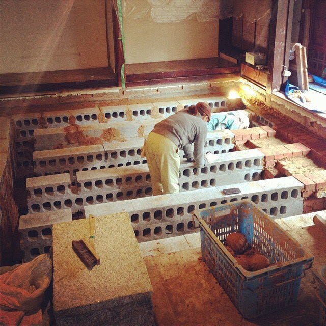 韓国から先生をお呼びして行ったワークショップにて。床下はブロックで煙の道を作っています。