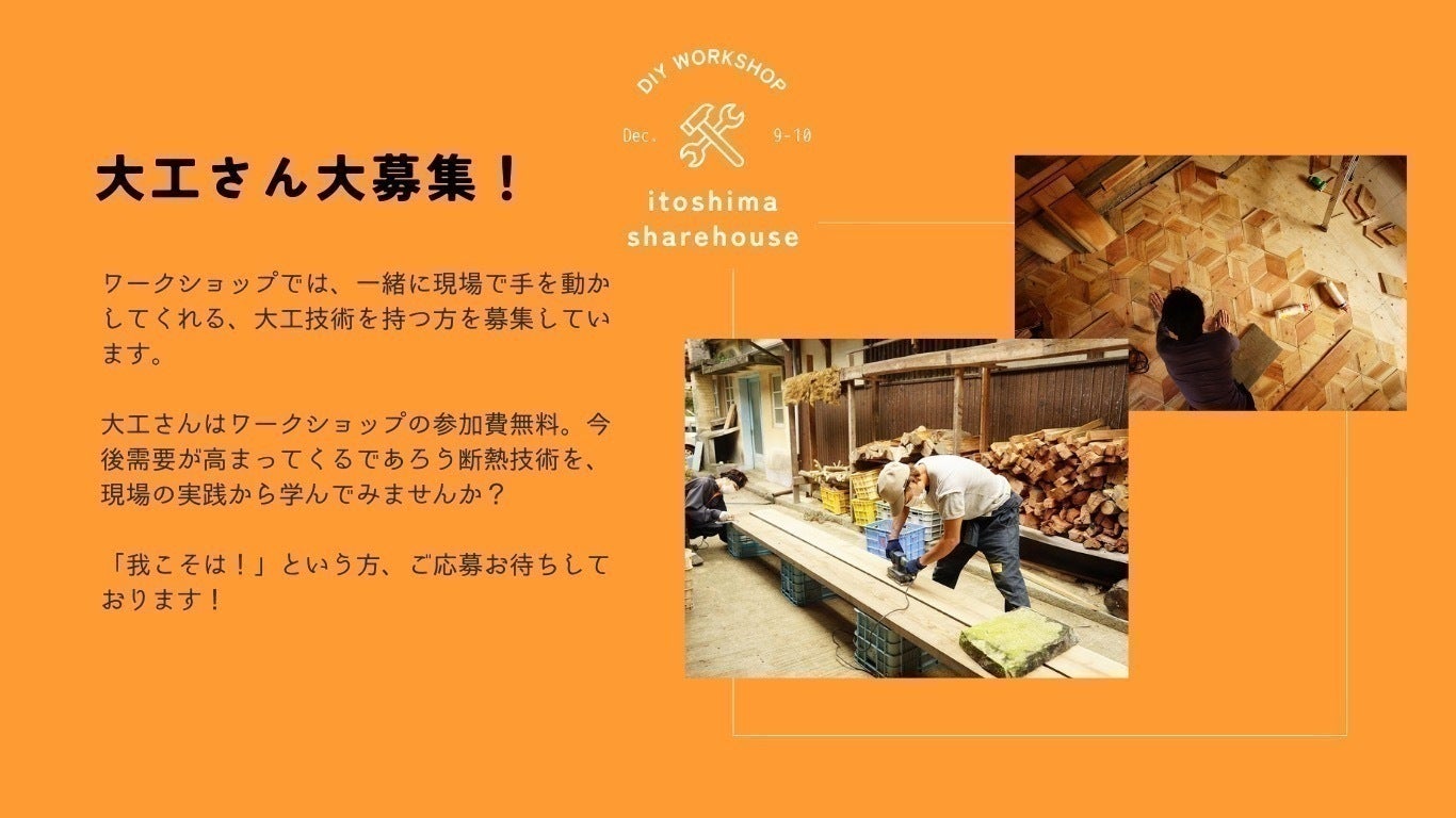 断熱不十分の建築物が約7割という状況の日本では、断熱の概念がまだ十分に浸透しておらず、断熱・気密を正確に理解している施工者と出会うことはとても難しい状況です。今回は日本でも数少ない断熱のプロを招待し、断熱技術についてのお話や断熱DIYのワークショップを行っていただきます。ワークショップでは、本格的な断熱DIYはもちろん、特別な工具を使わずに作れる断熱グッズなども作成していく予定です。