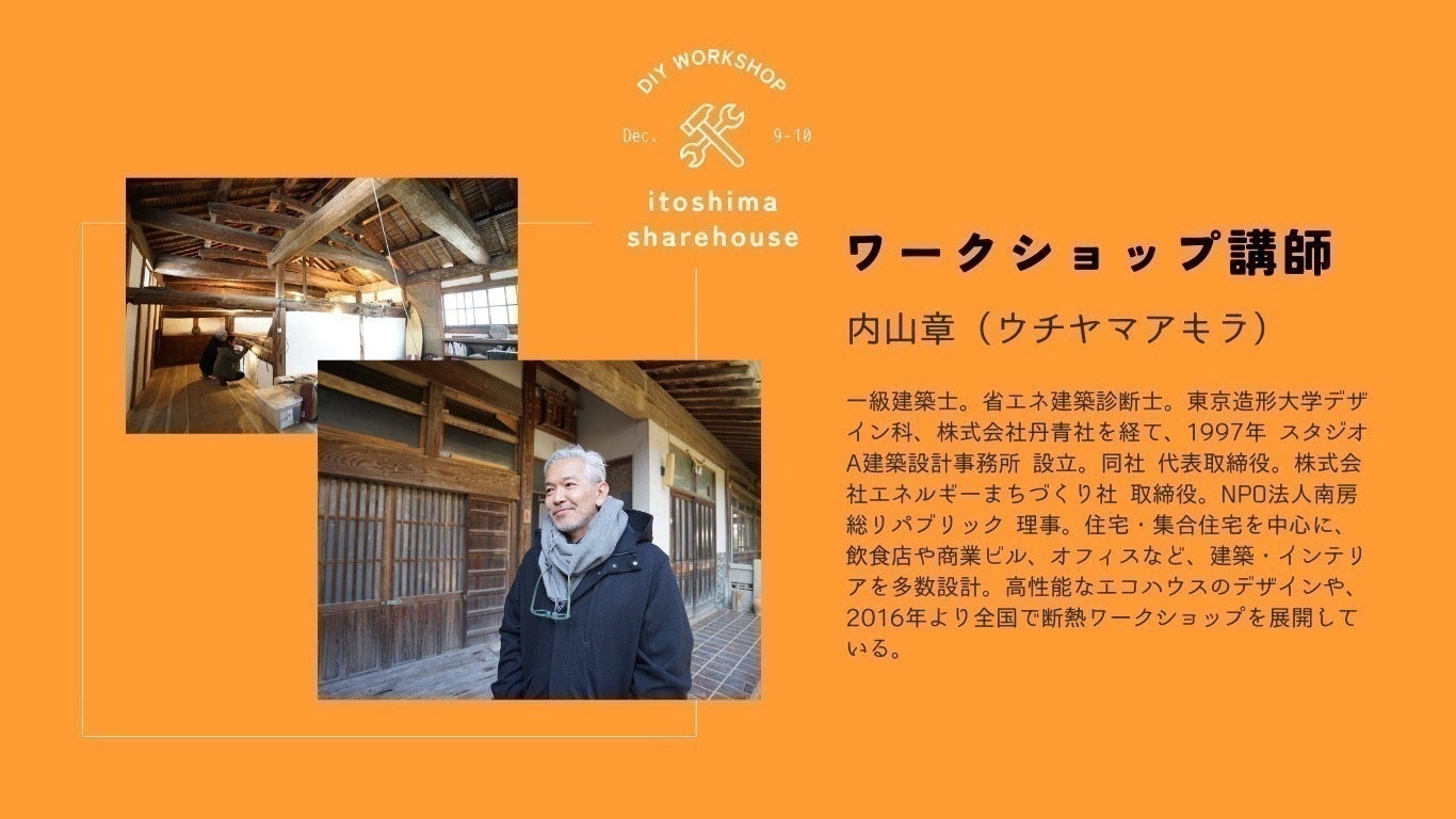 ワークショップは、12/9-10の二日間。一級建築士であり省エネ建築診断士の内山章さんを講師に、オンドル部屋を含むリビング二間を断熱します。
