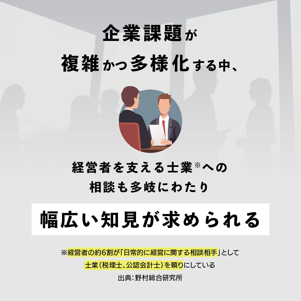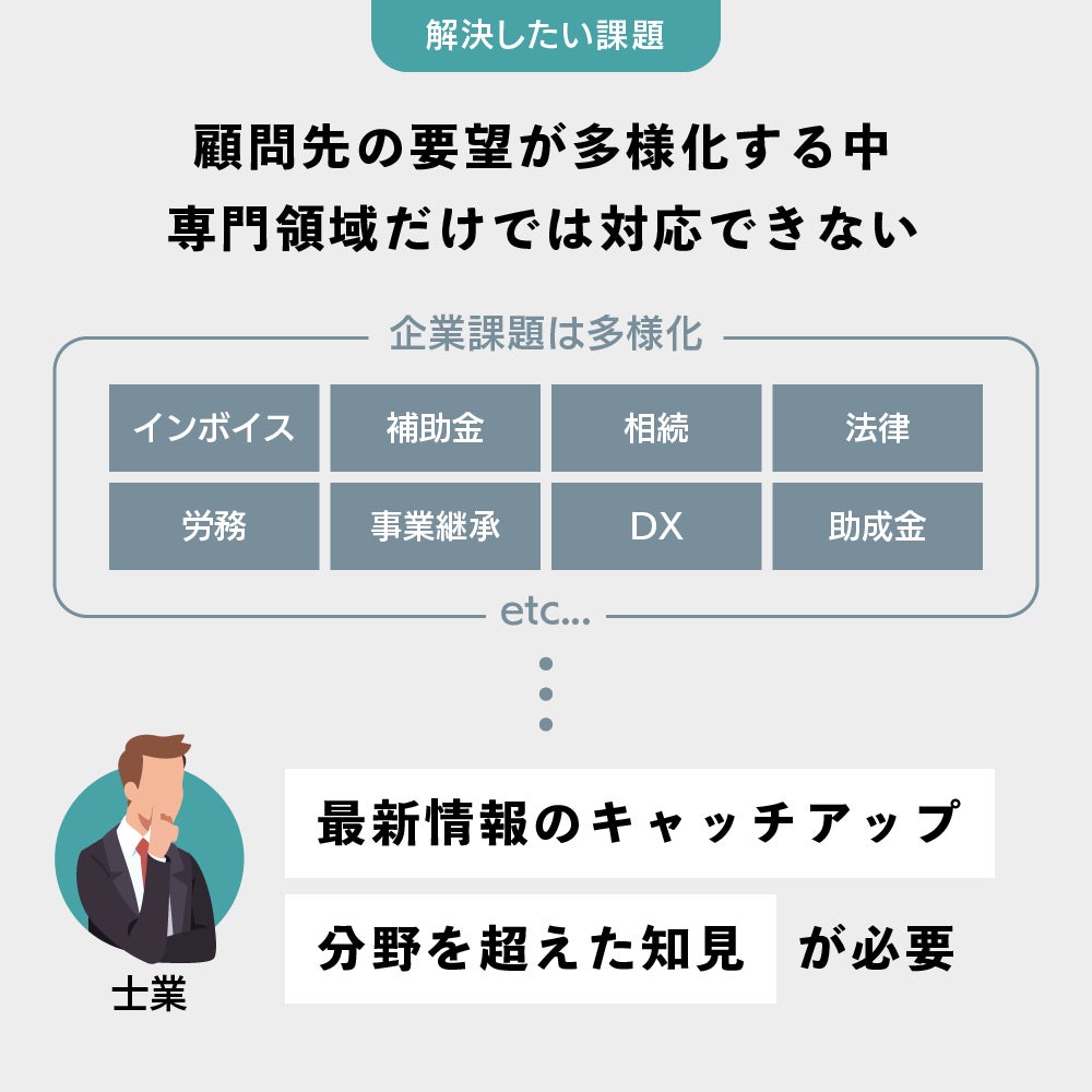 士業は、他士業の最新情報や動向に疎かったりチームがないと、顧問先からの経営相談や多様なニーズに対応することが難しいのが実情です。