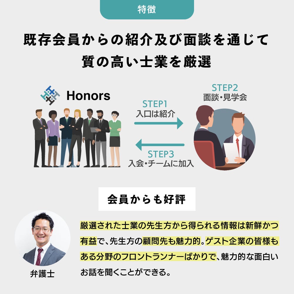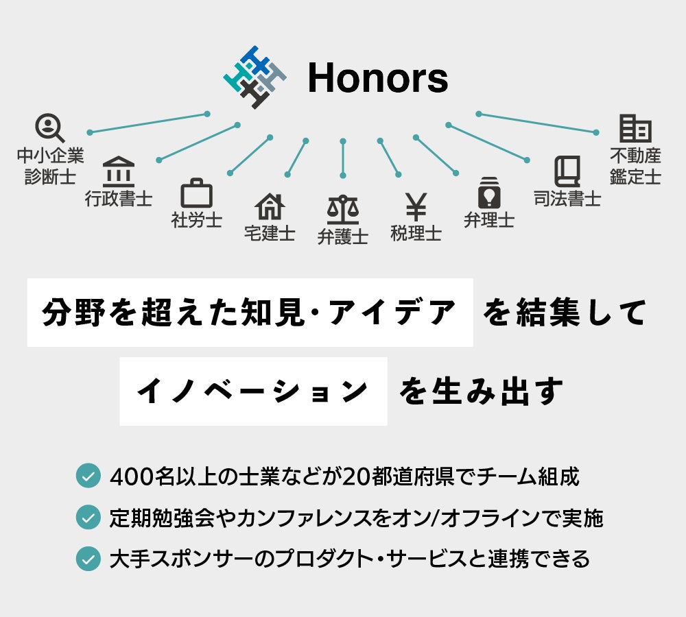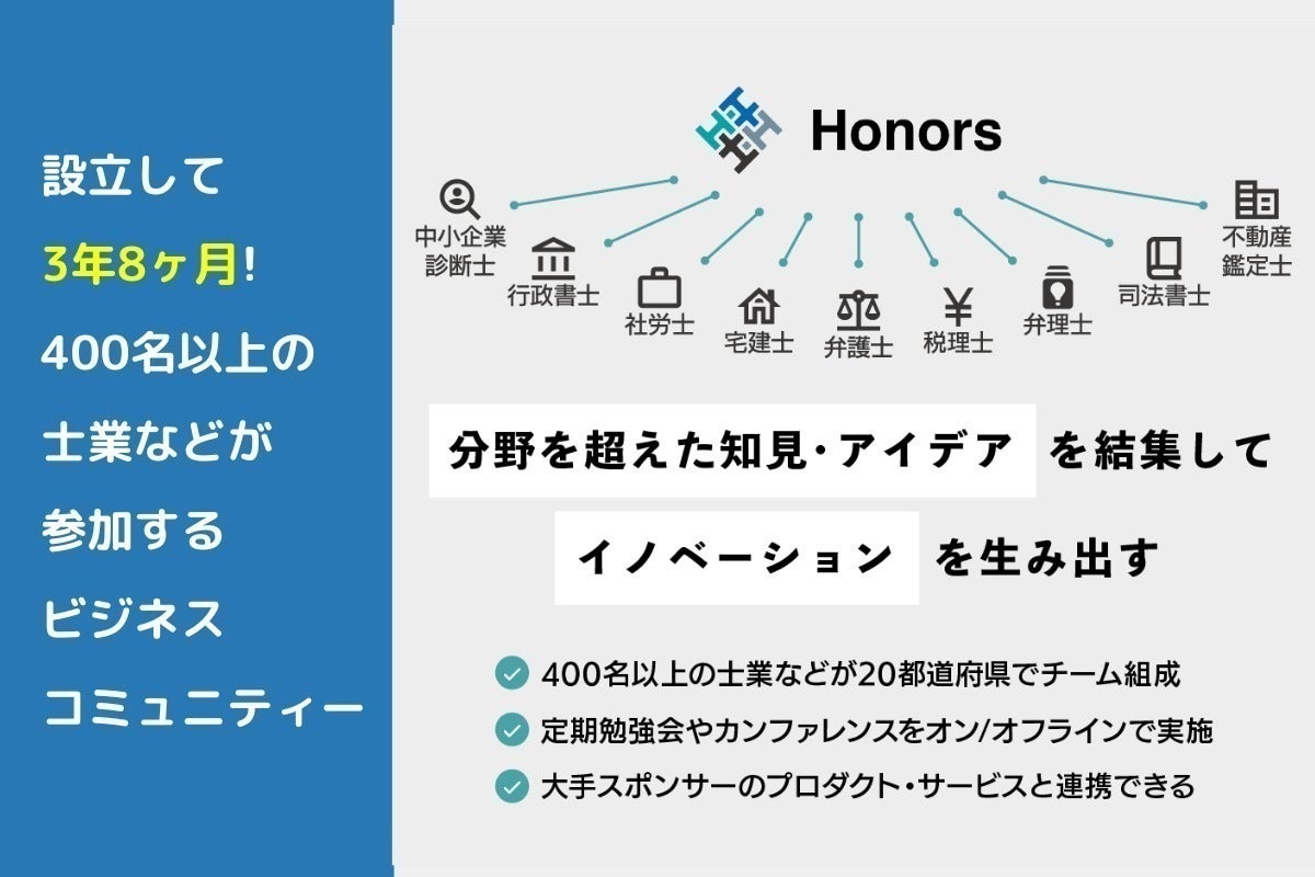 こういった中小企業経営者、士業それぞれの悩みを解消し、日本経済を元気にしていくアプローチが、士業コミュニティ「Honors」です!