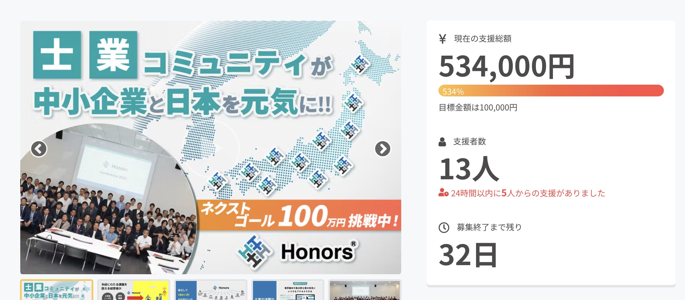 2023/11/29 13:05なんと!ネクストゴール50万円を1日で達成しました!ご支援本当にありがとうございます!正直ここまで早く達成するとは思っていませんでしたので、とても嬉しい反面、少し焦っております笑皆様の期待に応えられるように、このプロジェクト最後まで走り続けたいと思います!3rdゴールは100万円です!Honors認知拡大のために、このプロジェクトでは多数の支援者を必要としています。少額でもご支援いただくと嬉しいですし、情報拡散いただくだけでも本当にありがたいです。リターンは500円からご用意しておりますので、応援よろしくお願いいたします。まだまだ募集期間は続きます。最後まで応援よろしくお願いいたします!クラファン経由の新規ご入会も5名となりました!おかげさまで会員数は着実に増えておりますが、まだチームがない都道府県が26あります。そこで皆様にお願いです。今回のプロジェクトをきっかけにぜひお知り合いの士業の方、経営者の方にお声がけいただき、情報拡散していただけるとありがたいです。一緒に中小企業経営者、士業それぞれの悩みを解消し、日本経済を元気にしていきましょう!引き続き会員募集しております!ご興味ある方はぜひ説明会へご参加ください。---------------------------------------------会員募集オンライン説明会の開催日時12月5日(火)18時〜12月15日(金)12時〜12月25日(月)12時〜---------------------------------------------お申込は下記URLの問い合わせフォームよりお願いいたしますhttps://honors.jp/ もっと見る