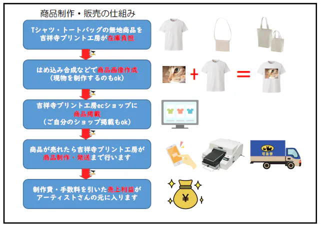 これは、アーティストさんに負担をかけず、真の収益を得られるようにと考えた、在庫負担無し、ショップ開設の手間・資金不要、発送の手間無しという仕組みです。