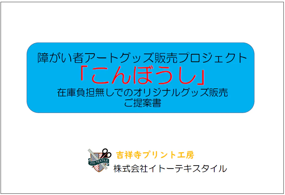 今回は、私が心を込めて運営する障がい者アーティスト専門プリント製品ショップ「こんぼうし」について、多くの方に知っていただきたいと思い、このクラウドファンディングに挑戦します。