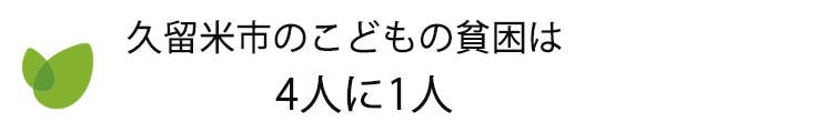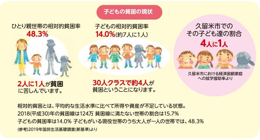 実は、現在日本では7人にひとりが貧困の状態にあると言われているのです。そして、私たちが拠点を置く久留米ではその子どもたちの割合は4人にひとり。(参考 厚生労働省国民生活基礎調査、久留米市子どもの貧困対策推進計画より)