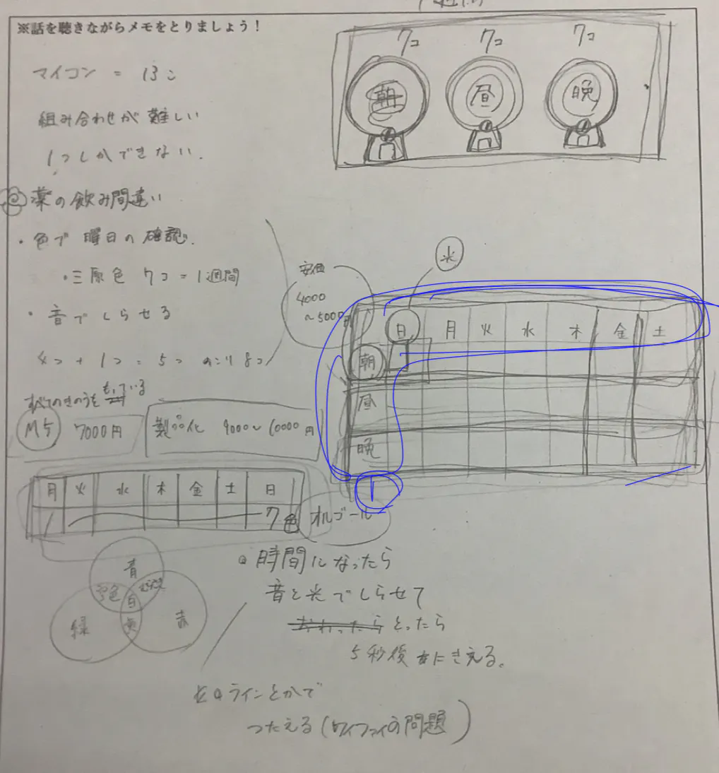 私たちは、そのうちの一つである高齢者の服薬に関する問題に着目し、薬の飲み忘れ・飲み間違いを防ぐための装置を作製するプロジェクトを始動しました。