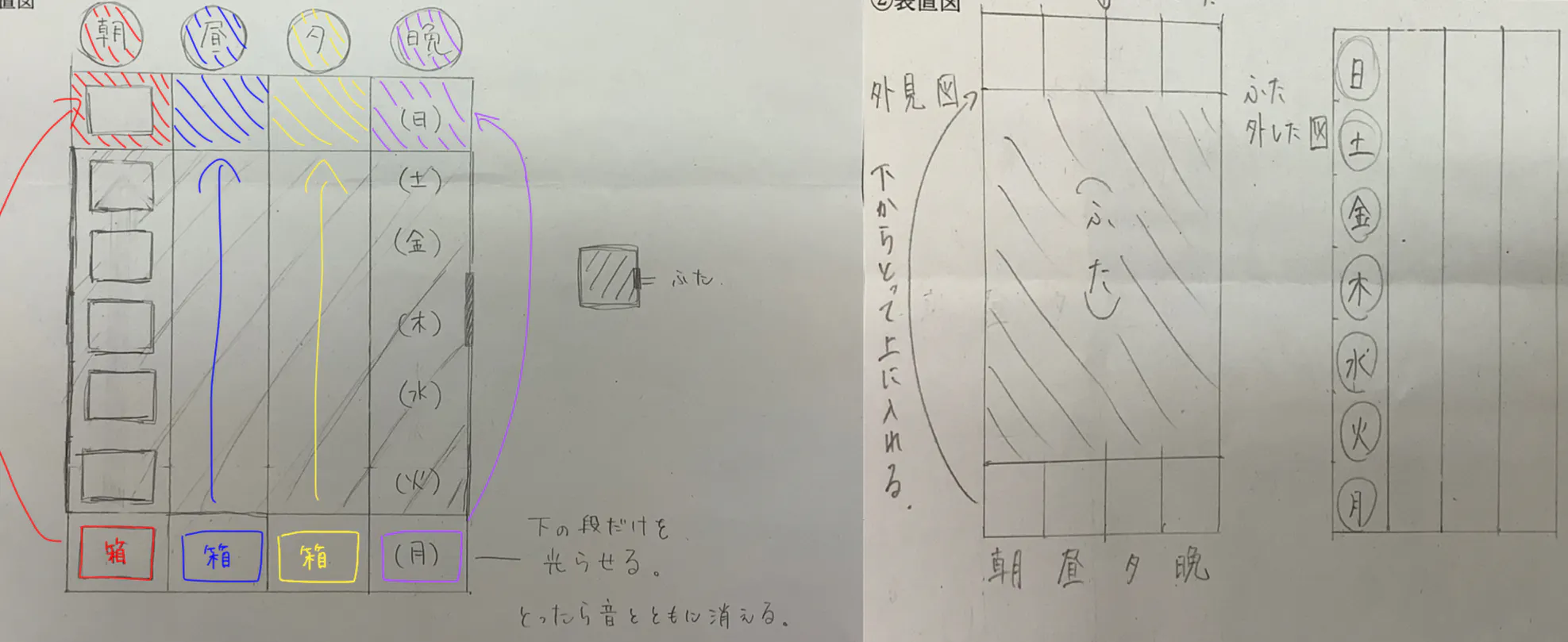 薬を飲む時間になったら、薬を取り出すまで音と光が知らせてくれるようにします。光は、朝、昼、夕、晩と4色にし、ケースもそれに対応した色にします。音は、薬の入ったケースから薬を取り出し、装置に戻したら音が止まる仕組みです。そして、ダルマ落とし式にし、飲み終わった入れ物を上から落としたらセンサーに当たってLINEに通知が届く仕組みにしました。