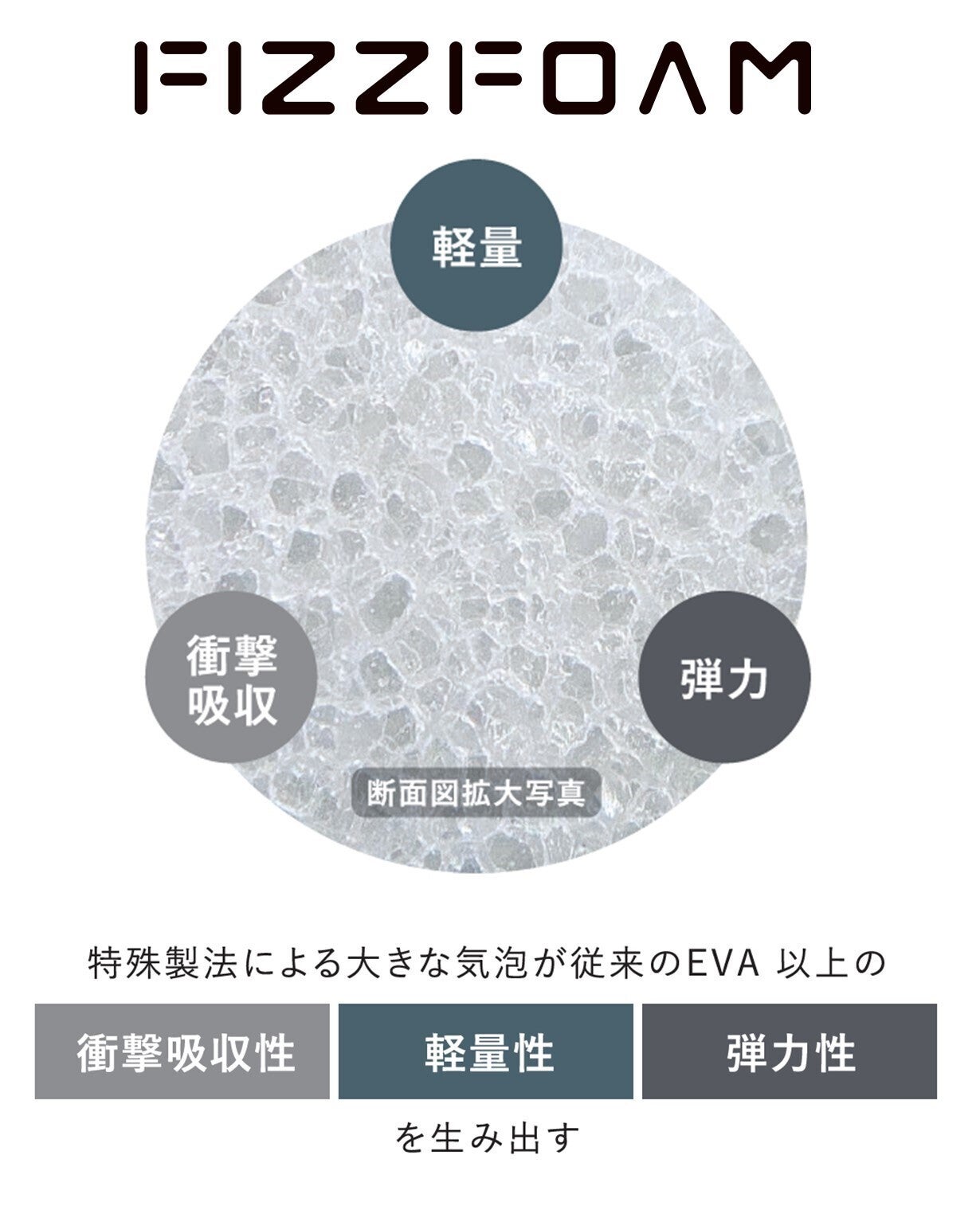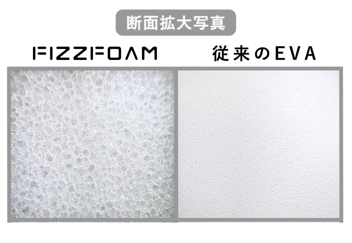 広島化成のFIZZFOAM (フィズフォーム)は、EVAを特殊な製法で発泡させた新しいクッション素材です。 一つ一つの気泡の中に閉じ込めた空気の層が高いクッション性と軽量性を生み出します。