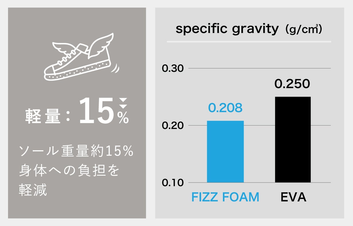 EVAの体積を減らし、空気の体積を増やすことにより軽量性が高まります。
