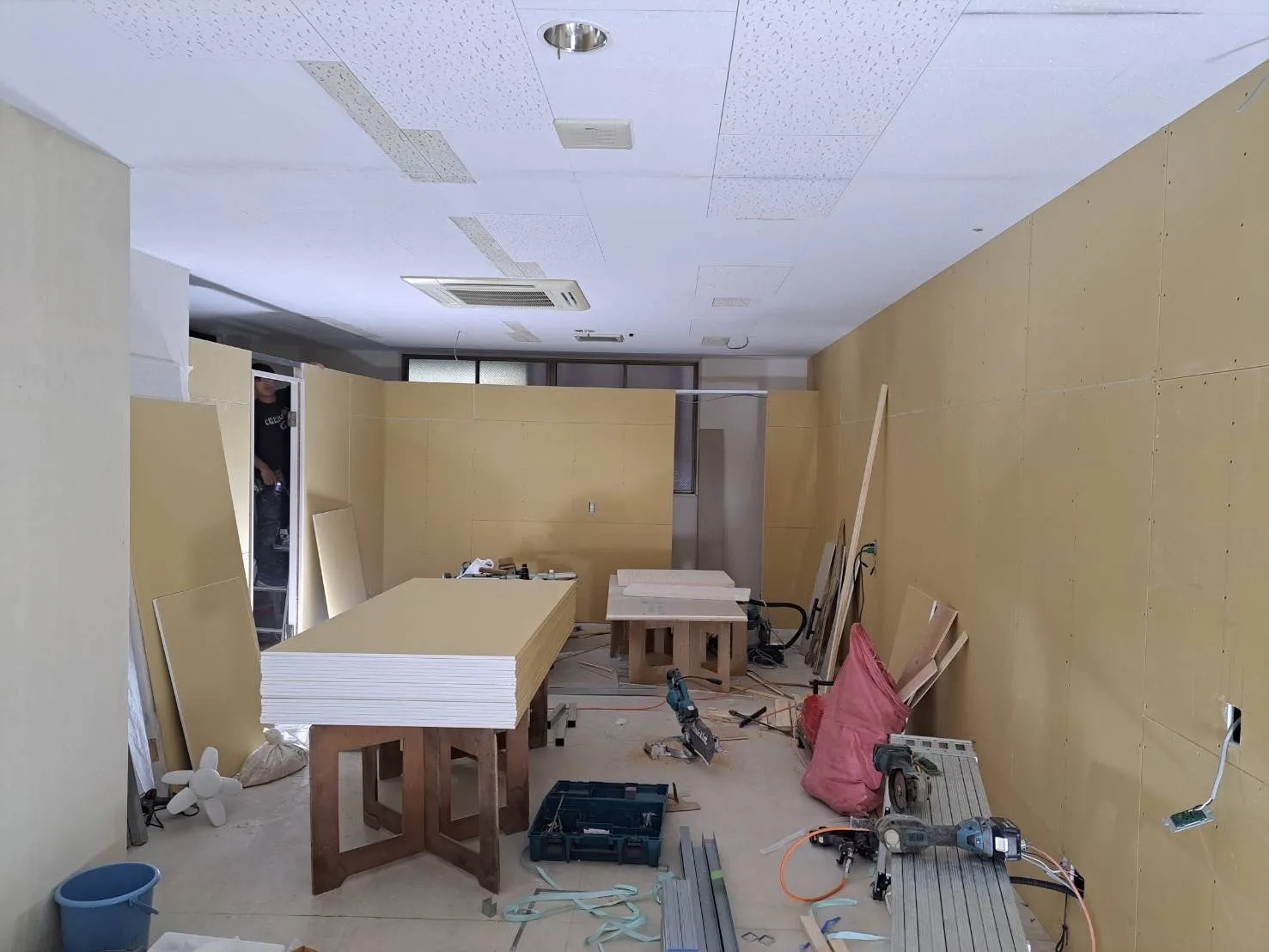 上記のような内装打ち合わせが終わり、今週から実際に施工が始まったのですが、あっという間に店内に壁が新しく作られました…!雰囲気がガラリと変わって、ここから更にどうなっていくのか楽しみです!