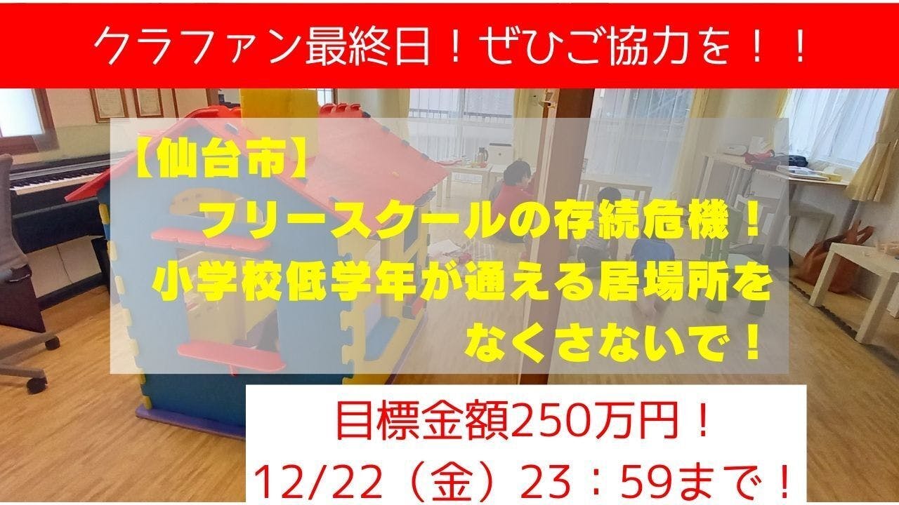 2023/12/22 19:37皆様こんばんは!何ということか、、、もう最終日になってしまいました。泣たくさんのご支援を頂いて19:24現在のご支援総額が2,311,500円、92%達成という所までまいりました。本当にありがとうございます。昨日はふふふる~むでのクリスマス会でした。通ってくれている子ども達がお母さんに「僕のお小遣いを全部あげるから、ふふふる~むをなくさないで」と言ってくれたそうです。そういう優しい子たちに、本当の優しい世界を見せたい。達成したよ!安心してね!と、クリスマスプレゼントをあげたい。ぜひご協力をお願いします。そして、すでにご支援頂いた皆様にはお知らせが大変不足してしまったのですが、新しいリターンを3種類、少し前に追加しております。【おしゃべりor相談コース】 武山とオンライン(Zoom)でお話できるチケット(お知り合いへのプレゼントにも利用可!)10000円 【ハンドメイド羊毛小物・宮城のおいしい珈琲セット】 ●心をこめて選んだり、子ども達と作ったものを郵送させて頂きます。15000円(KURIYAさんのコーヒーおすすめです!!)【ふふふる~む主催特別感謝イベントへのご招待チケット】 ●フリースクールでささやかなパーティーを開かせて頂き、そちらにご招待させて頂きます。※15000円のコースと同じ内容でお土産つき!20000円の3つのコースです。追加のご支援も大歓迎ですし、同じ金額のものでしたら交換(差額をお出し頂いての交換ももちろん可能)対応させて頂きます。<詳細はホーム画面から>https://camp-fire.jp/projects/view/715597ぜひご活用ください!残り4時間。いえ、まだあと4時間もある!拡散シェアもギリギリまでありがたいです!よろしくお願いいたします! もっと見る【15日までに100万円達成を目指します!】 ●「大人」って誰なのか?