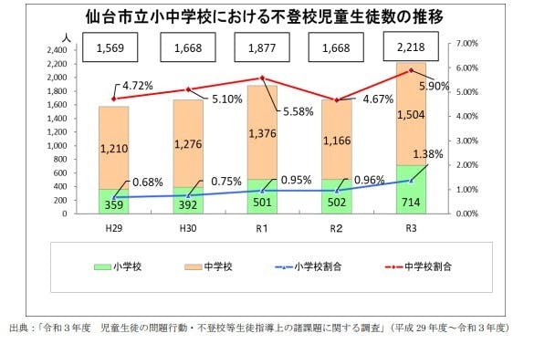 全国的に不登校の数が増えている中、仙台市も同様の状況で、不登校全体の人数も、小学生の人数も増え続けています。