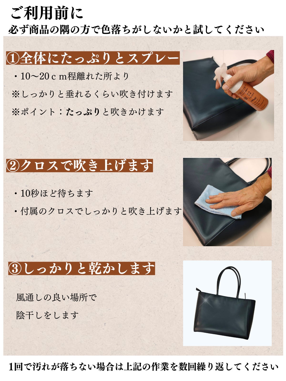 ・ご使用前には必ず目立たない所で、色落ち等の確認をしてください