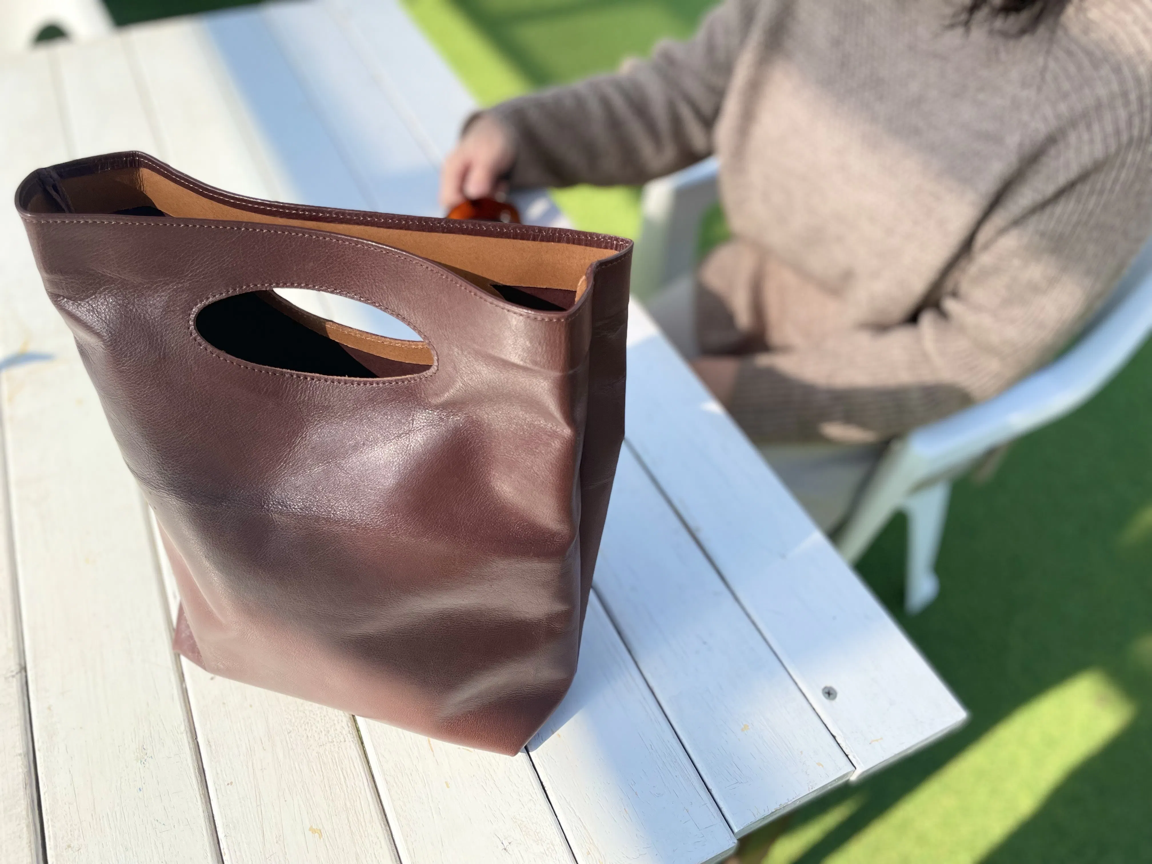 床革とは、革の厚みを整える際にできる革の下層部を指します。床革は廃棄されることが多いため、デッドストック革のプロジェクト中で出るものは有効利用したく、今回は持ち手の内側に補強として床革を使用しました。