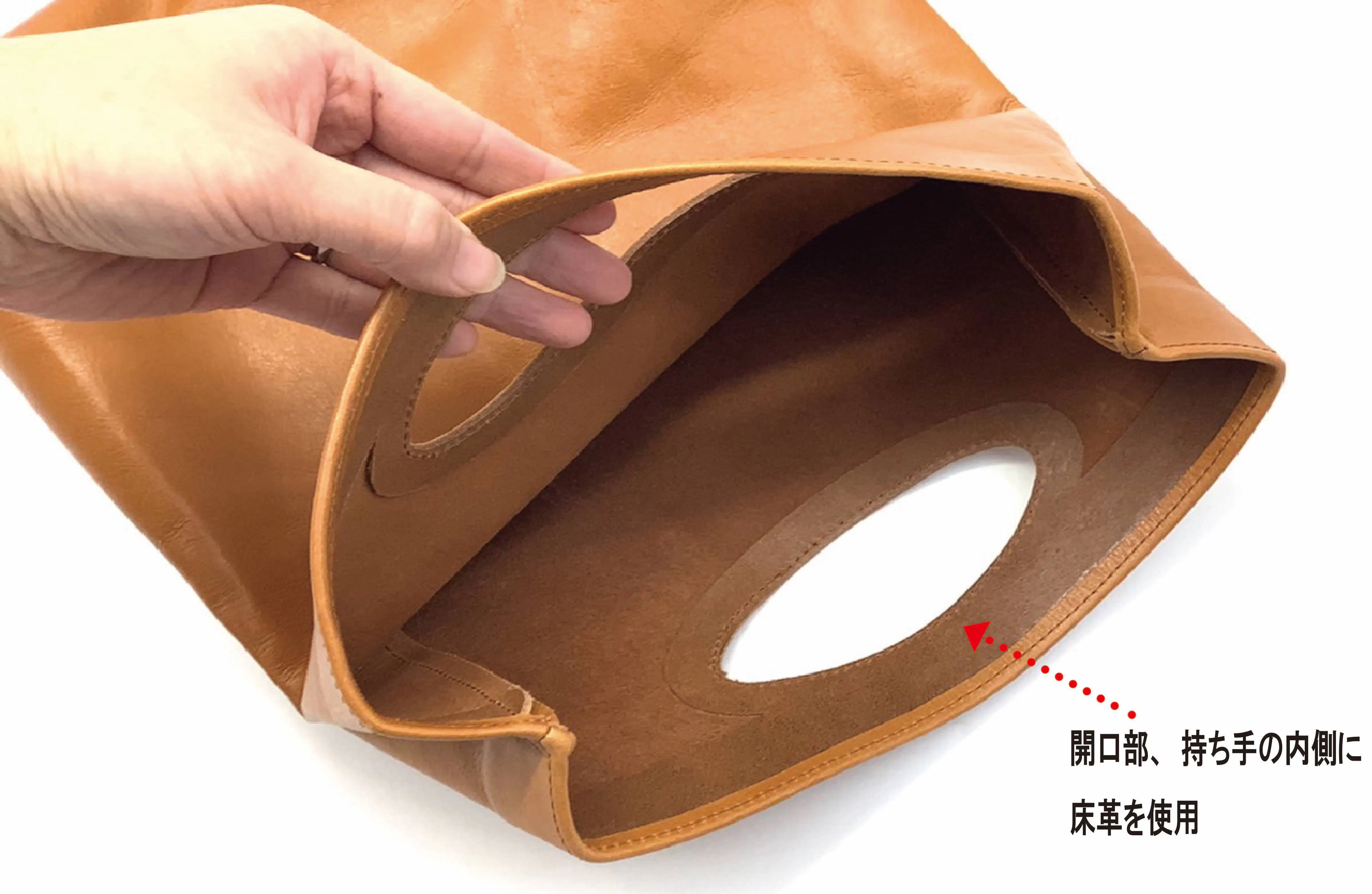 POINT②持ち手の補強には床革を使用。よりエコに!