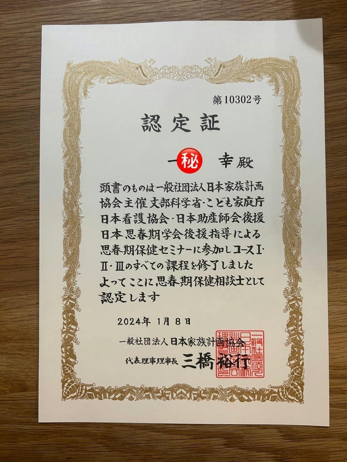 2024年1月 思春期保健相談士認定(見込み)