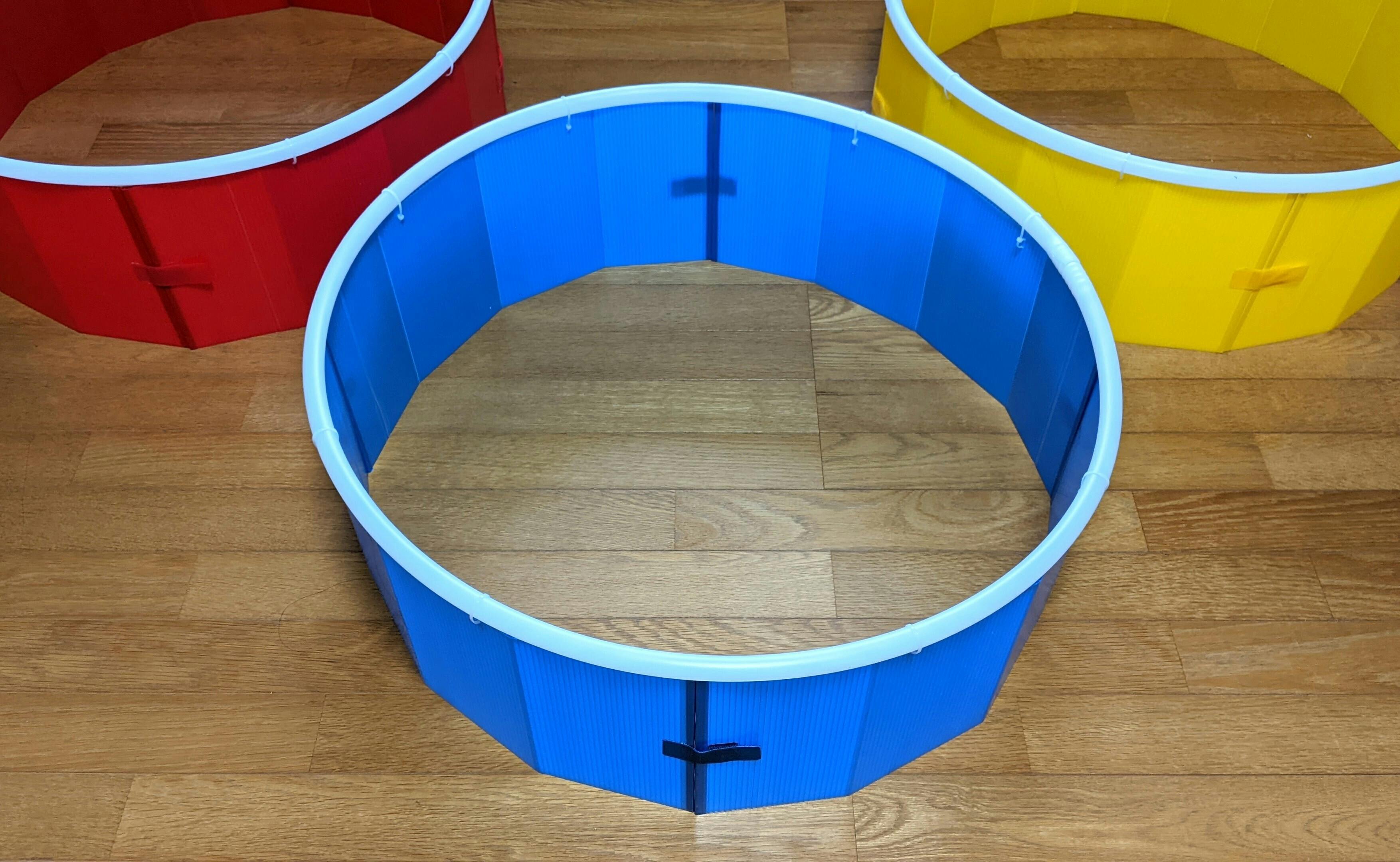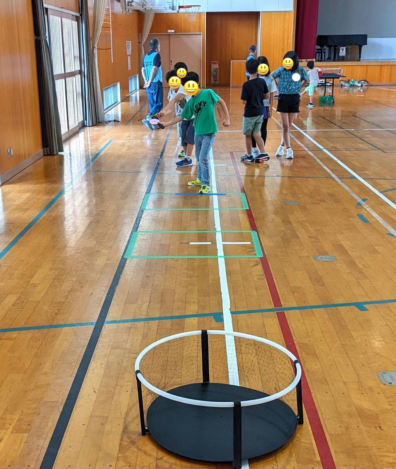 こちらのプランは、小学校の体育館で行う場合に、他の遊びや順番待ちの方との仕切りで使う間仕切りネット有りのプランです。またネットを使わないコミュニティセンター等でも可能な用具です。