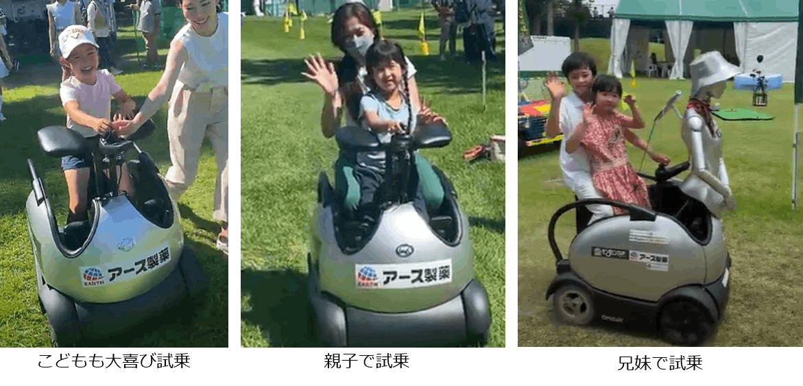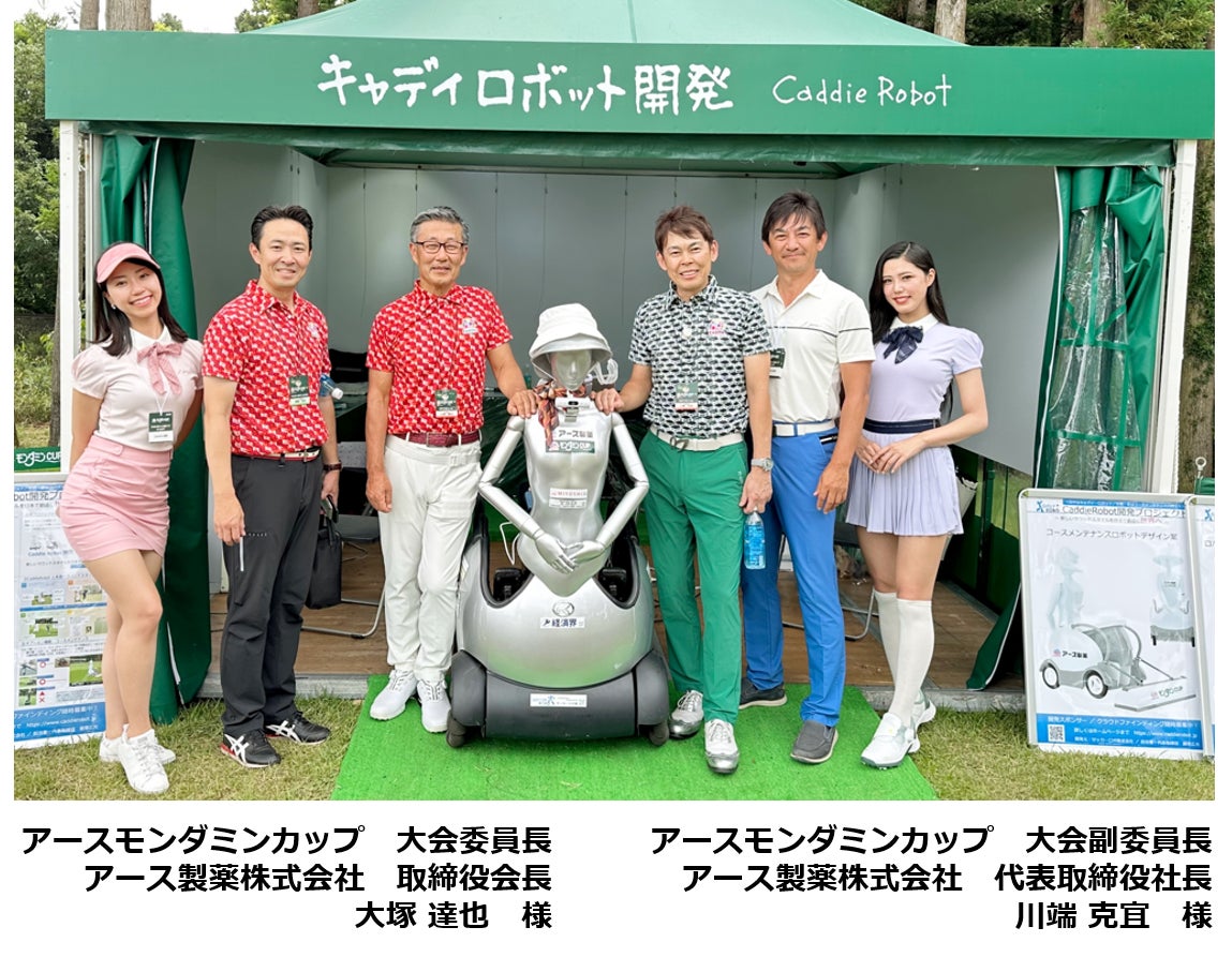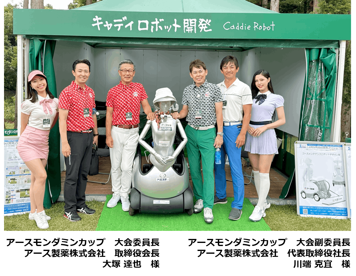 2022年6月、このプロジェクト最大の支援者であるアース製薬・大塚達也会長、川端克宜社長のご厚意で、LPGA国内女子ゴルフツアー「アースモンダミンカップ2022」にて「キャディロボット開発ブース」の出展をさせていただきました。(2022年度出展の様子)