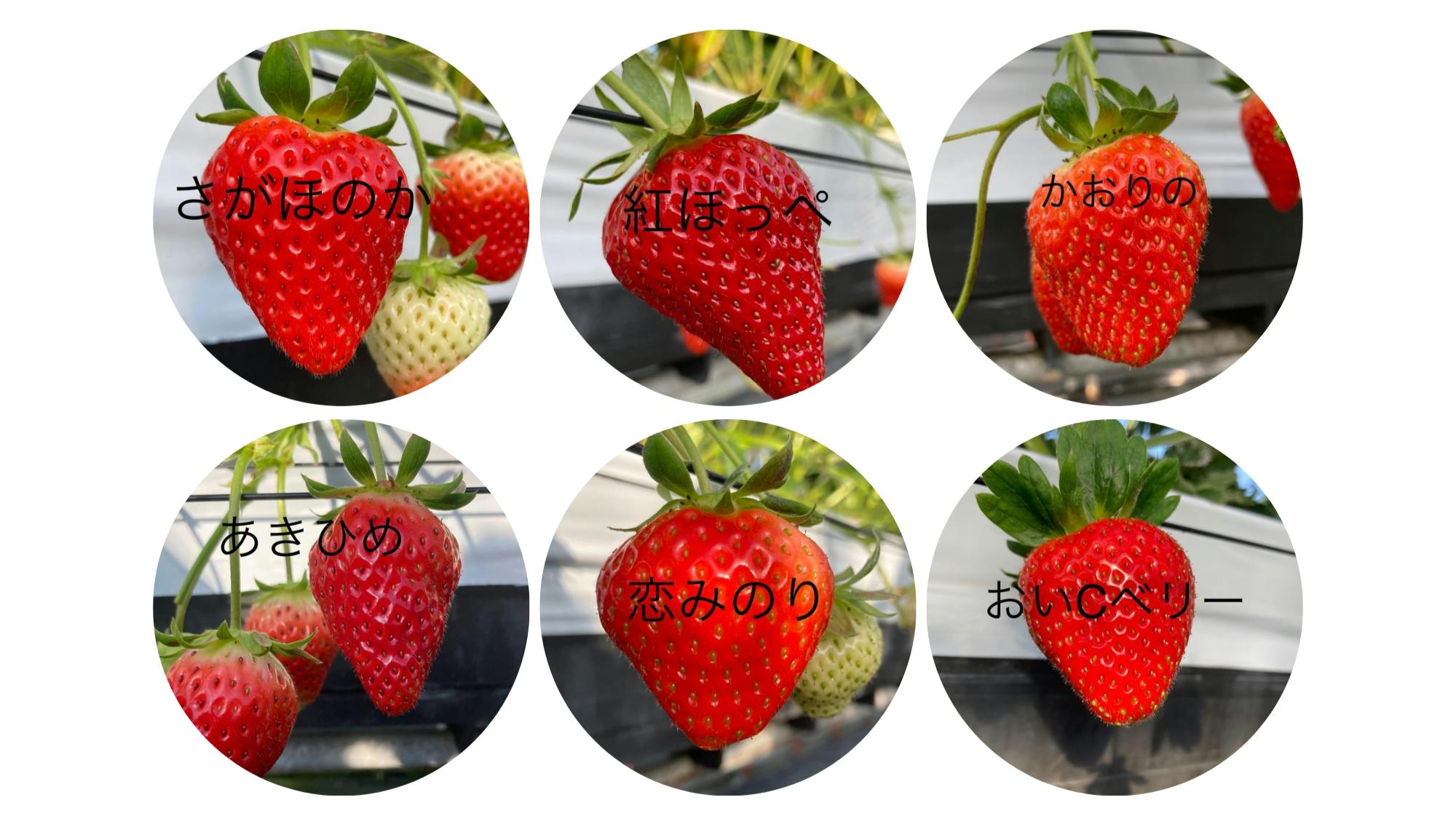 イチゴ屋けんちゃんで取り扱っているイチゴは、さがほのか、紅ほっぺ、あきひめ、かおりの、恋みのり、おいCベリーの6種類。どのイチゴも、甘みが強く酸味もあり、バランスが良くて大人気!さらに贈答品としても好まれる、形もよい品種を選んで栽培しています。