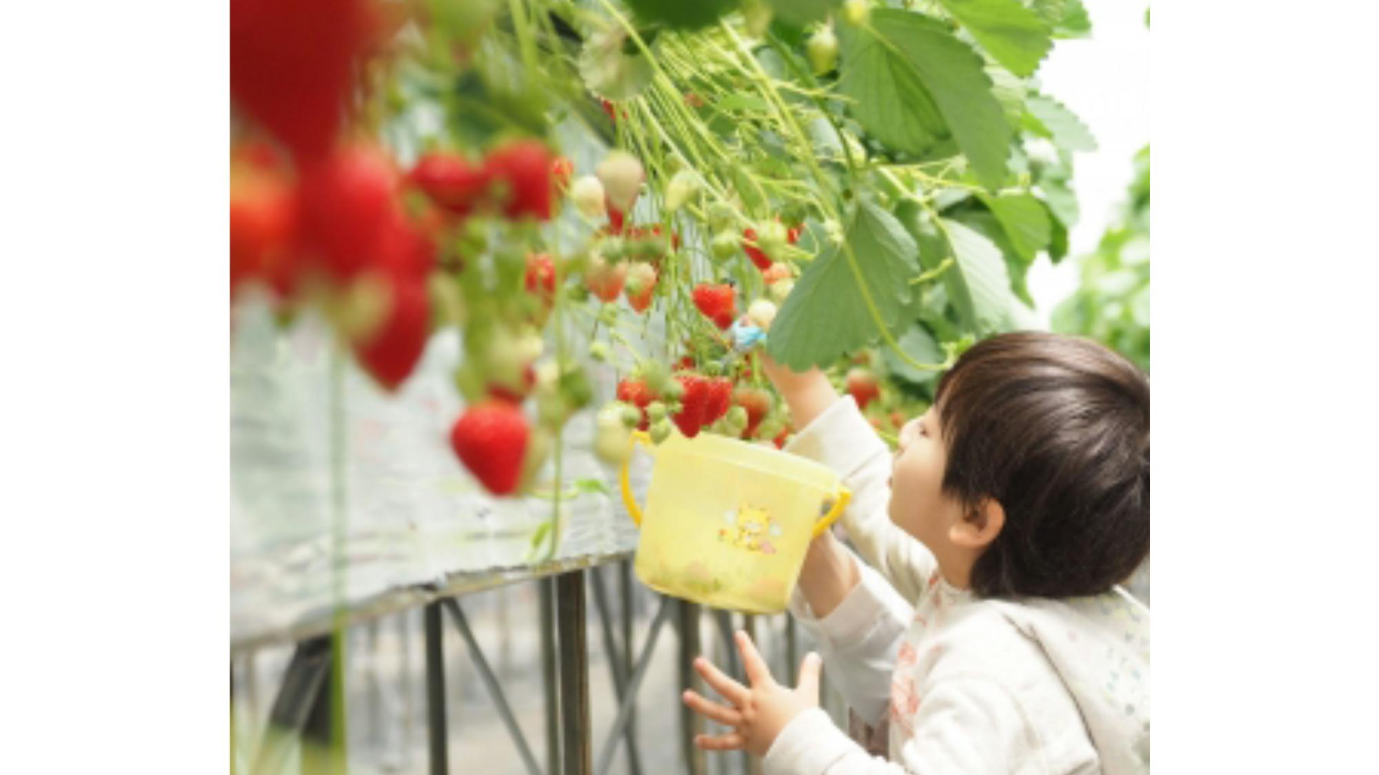 また、腰の高さの位置で栽培する高設栽培を採用しており、イチゴの世話の際もイチゴ狩りの際も、無理な姿勢を取らなくてすむため腰に負担がかかりません。お子さんからご年配の方まで、イチゴ狩りを楽しんでいただけます。