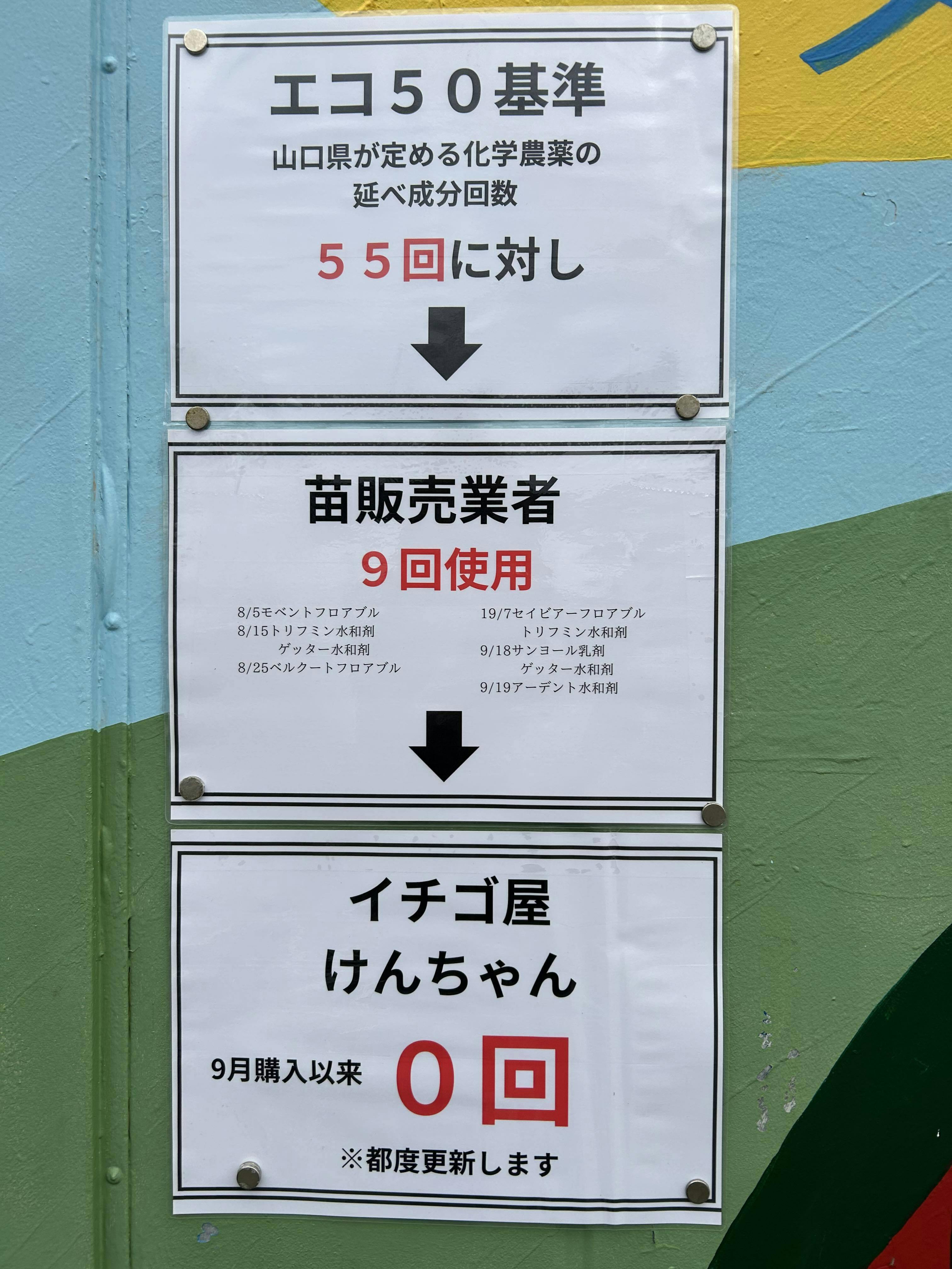 山口県慣行基準と5割低減の基準リストによると、イチゴの化学合成農薬の延べ成分回数は55、5割低減基準は27以下となっており、最低でもこの基準をクリアしたいと考えています。今シーズンのイチゴが上手くいけば、次は育苗から、農薬を限りなく使わずにトライする予定です。