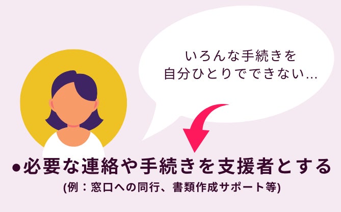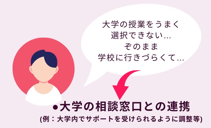今までは何とかなっていた、家族がフォローをしていた、など急に明らかになったケースなどは、日常過ごしていたら"あたりまえ"と思われる部分「が」「で」立ち止まってしまうことが起こってきます。進路が進むにつれて、年齢を重ねていくなかで、困っていることに対して、具体的に本人だけで対処することが難しいことに気づくということが多くあります。また、そもそも自分の困っていることを自分で把握し、適切に他人を頼ったり、出来事に合わせた窓口を利用するなどのことが、難しいことが明らかになっていくことが起こります。