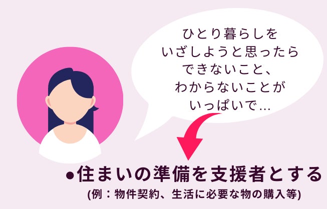 障害のある方の一人暮らしを中心にサポートする「福祉サービス」です。障がいのある方が、一人暮らしをしている、または始めるにあたり、暮らしの準備で困りやすいことから、暮らし始めてからわかる困りごとまで、暮らしにまつわる全般の相談ができます。また、1年間という期間を目安にして、支援者ありきの生活ではなく、必要な時に必要な人や場所に頼りながら、安心して自立した生活ができるように支援者と一緒に準備・練習をしていく福祉サービです。